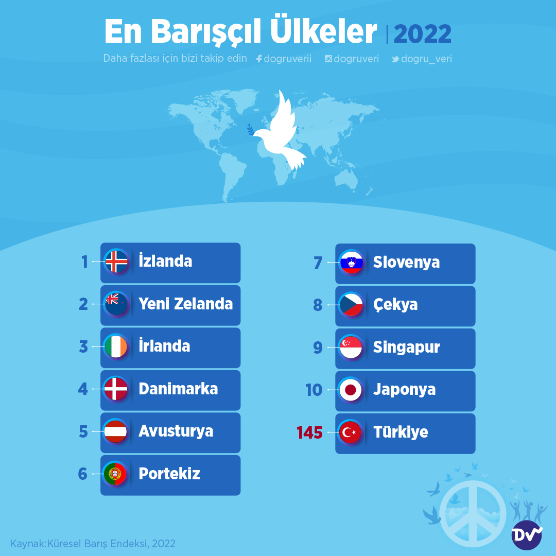 AnasayfaDiğerEn barışçıl ülkelerDiğer En barışçıl ülkeler Paylaş 2022 Küresel Barış Endeksi’ne göre en barışçıl ülkeler arasında ilk üç sırayı İzlanda, Yeni Zelanda ve İrlanda alırken Türkiye 145. sırada yer aldı. Kaynak: Küresel Barış Endeksi, 2022 326 Paylaş