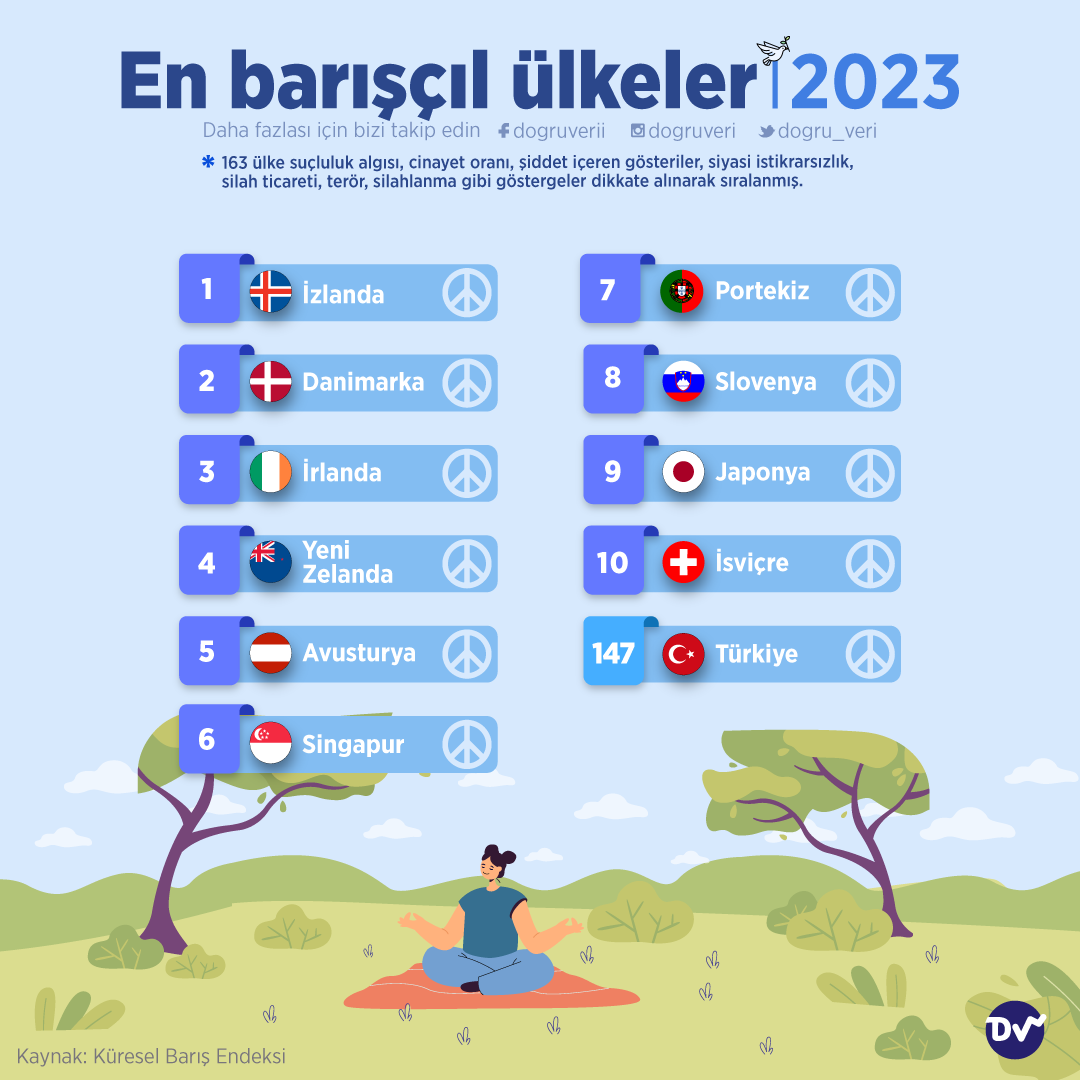 Küresel Barış Endeksi’nin 2023 verilerine göre en barışçıl ülkeler bu şekilde sıralandı. 163 ülke suçluluk algısı, cinayet oranı, şiddet içeren gösteriler, siyasi istikrarsızlık, silah ticareti, terör, silahlanma gibi göstergeler dikkate alınarak sıralanmış.