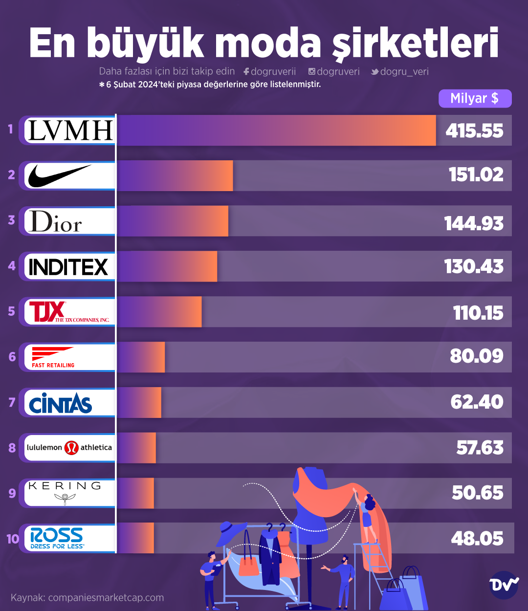AnasayfaDiğerEn büyük moda şirketleriDiğer En büyük moda şirketleri Paylaş En büyük moda şirketlerini araştırdık. Companies Market Cap’e göre pek çok lüks yan markası bulunan LVMH 415 milyar dolarlık piyasa değeri ile zirvede yer alıyor. 114 Paylaş