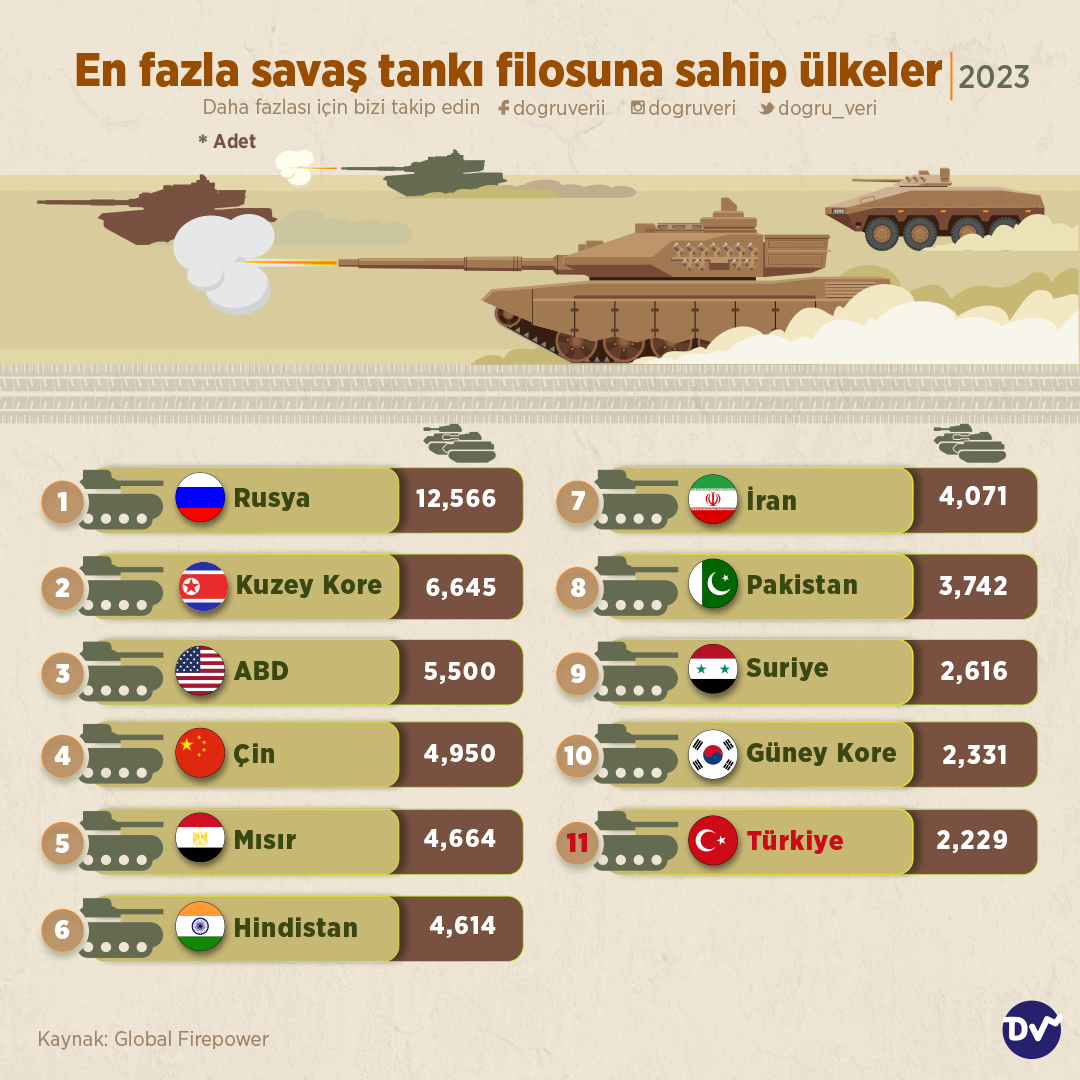 AnasayfaAskeriEn büyük savaş tankı filosuna sahip ülkelerAskeri En büyük savaş tankı filosuna sahip ülkeler Paylaş En büyük savaş tankı filosuna sahip ülkeleri derledik. 12.566 adet tank ile Rusya ilk sırada yer alırken Kuzey Kore 6.645 adet tank ile 2. sırada ve ABD 5.500 adet tank ile 3. sırada yer aldı. Türkiye ise 2.229 tank ile listede 11. sırada yer aldı. 1.160 Paylaş