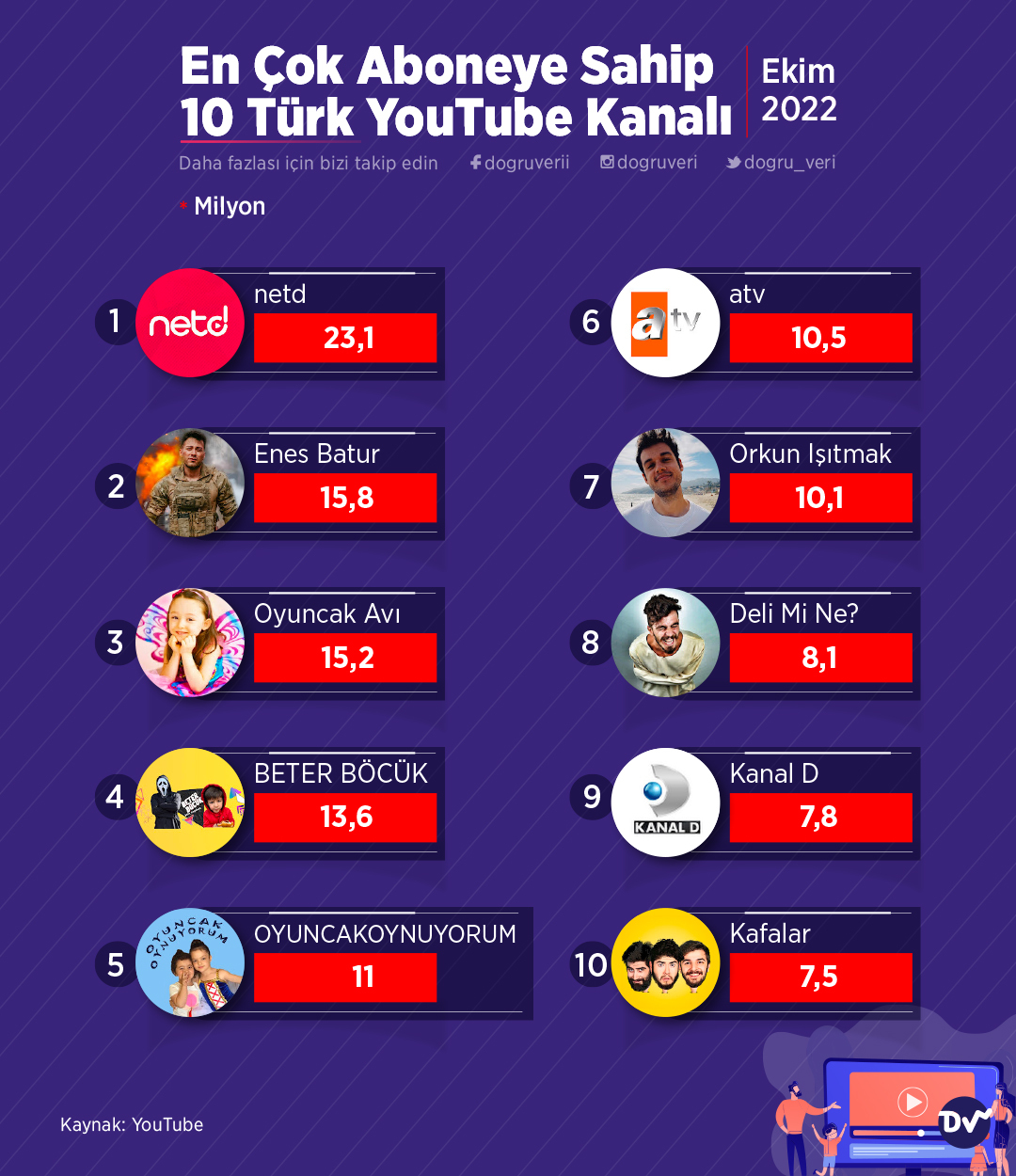 YouTube’un Ekim 2022 raporuna göre en çok aboneye sahip 10 Türk YouTube kanalını listeledik. İlk sırada müzik kanalı olan Netd yer alıyor. Televizyon kanallarından Atv ve Kanal D de ilk 10’a giren hesaplar arasında.