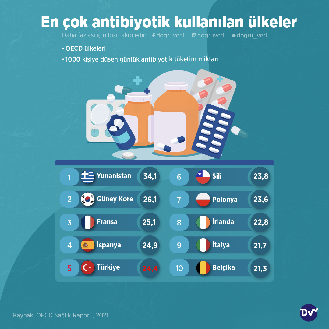 1000 kişiye düşen günlük antibiyotik tüketim miktarını baz alarak en çok antibiyotik kullanılan ülkeleri derledik. Sıralamaya göre antibiyotiğin en fazla kullanıldığı ülke yüzde 34,1 oranla Yunanistan olurken Güney Kore yüzde 26,1 oranla 2. sırada, Fransa yüzde 25,1 oranla 3. sırada, İspanya yüzde 24,9 oranla 4.sırada ve Türkiye yüzde 24,4 oranla 5. sırada yer aldı.
