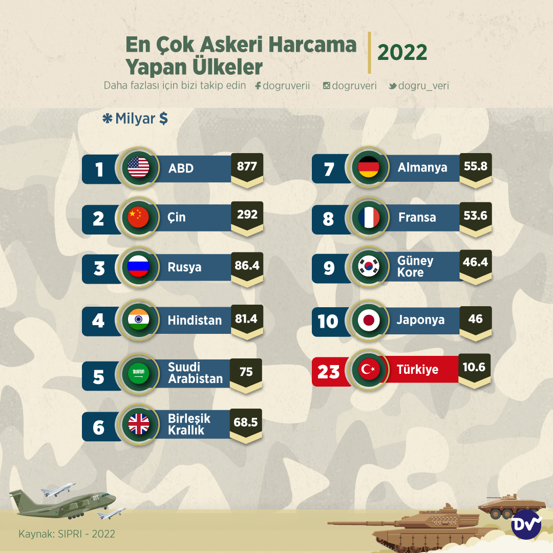 AnasayfaAskeriEn çok askeri harcama yapan ülkeler I 2022Askeri En çok askeri harcama yapan ülkeler I 2022 Paylaş SIPRI – 2022 verisine göre hazırladığımız “En çok askeri harcama yapan ülkeler” listesinin başında ABD, Çin ve Rusya geliyor. Türkiye’nin listedeki yeri ise 23. sıra. 362 Paylaş