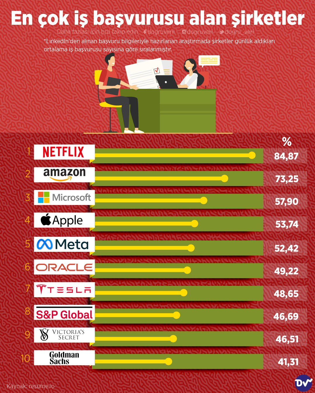 resume.io’nun verilerine göre en çok iş başvurusu alan şirketleri derledik. resume.io araştırmasında LinkedIn’den alınan başvuru bilgilerini kullanıyor. Şirketlerin günlük aldıkları ortalama iş başvuru sayısına göre sıralandığı araştırmada ilk sırada Netflix yer alırken onu Amazon, Microsoft ve Apple takip ediyor.