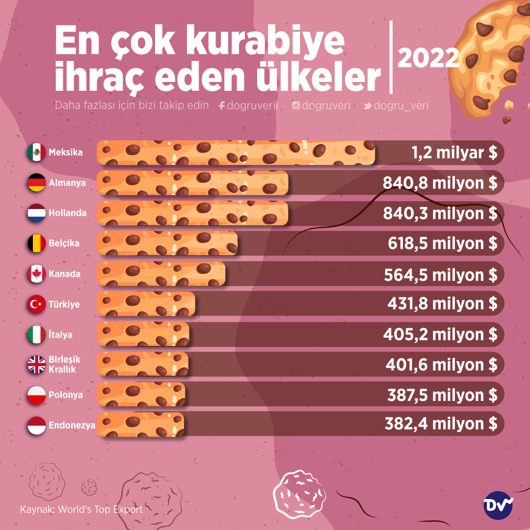 AnasayfaÜretim & TüketimEn çok kurabiye ihraç eden ülkeler (2022)Üretim & Tüketim En çok kurabiye ihraç eden ülkeler (2022) Paylaş World’s Top Export’tan aldığımız verilere göre 2022 yılında en çok kurabiye ihraç eden ülkeleri derledik. Buna göre kurabiye ihracatında Meksika, Almanya ve Hollanda ilk sıralarda yer alırken Türkiye 431,8 milyon $ ile dünyada 6. sırada yer alıyor. 84 Paylaş