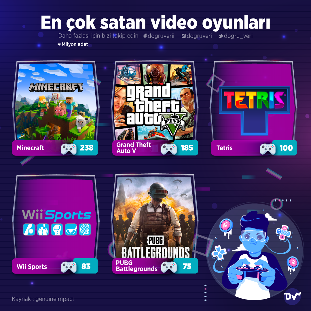 Dünyanın en çok satan oyunları belli oldu. Tüm zamanların en çok satış yapan oyunları listesinde ilk sırada 238 milyonla Minecraft yer alırken, ikinci sırada 185 milyonla Grand Theft Auto V, üçüncü sırada ise yılların vazgeçilmez oyunu 100 milyonla Tetris bulunuyor.