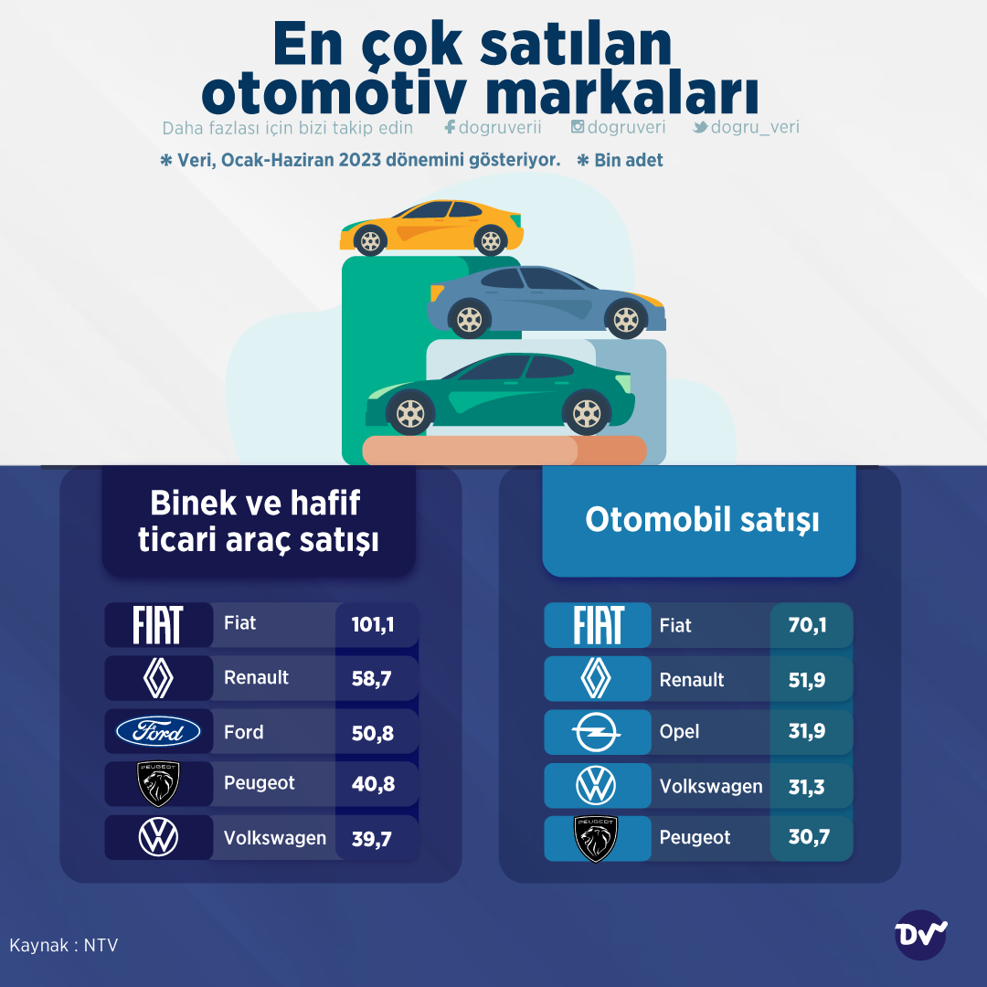 AnasayfaDiğerEn çok satılan otomotiv markalarıDiğerÜretim & Tüketim En çok satılan otomotiv markaları Paylaş İlk 6 ayda en çok satılan markalarını derledik. Ocak-haziran döneminde en fazla otomotiv satışı gerçekleştirilen marka 70 bin ile Fiat oldu. Fiat’ı 51 bin 905 satışla Renault takip ediyor. 93 Paylaş
