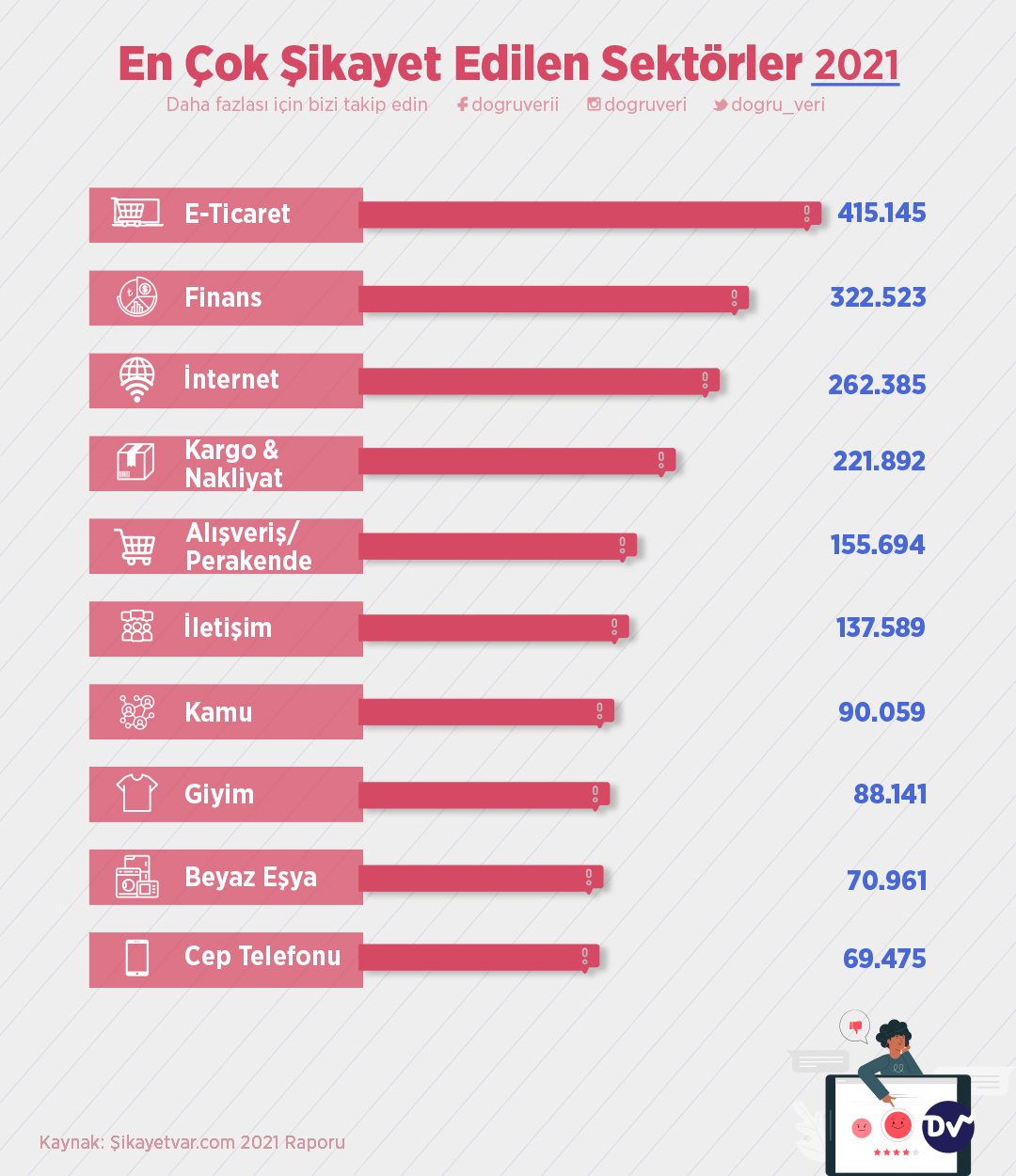 Şikayetvar’ın 2021 raporuna göre geçtiğimiz yıl en çok şikayet edilen sektör e-ticaret olmuş. Pandemi dönemini de işin içine kattığımızda beklenebilir bir sonuç olduğu okunabilir. E-ticareti yine alışverişin tamamlayıcı sektörlerinden finans, internet ve kargo & nakliyat takip etmiş. Giyim, beyaz eşya ve cep telefonu ise şikayetin en az olduğu sektörler arasında.