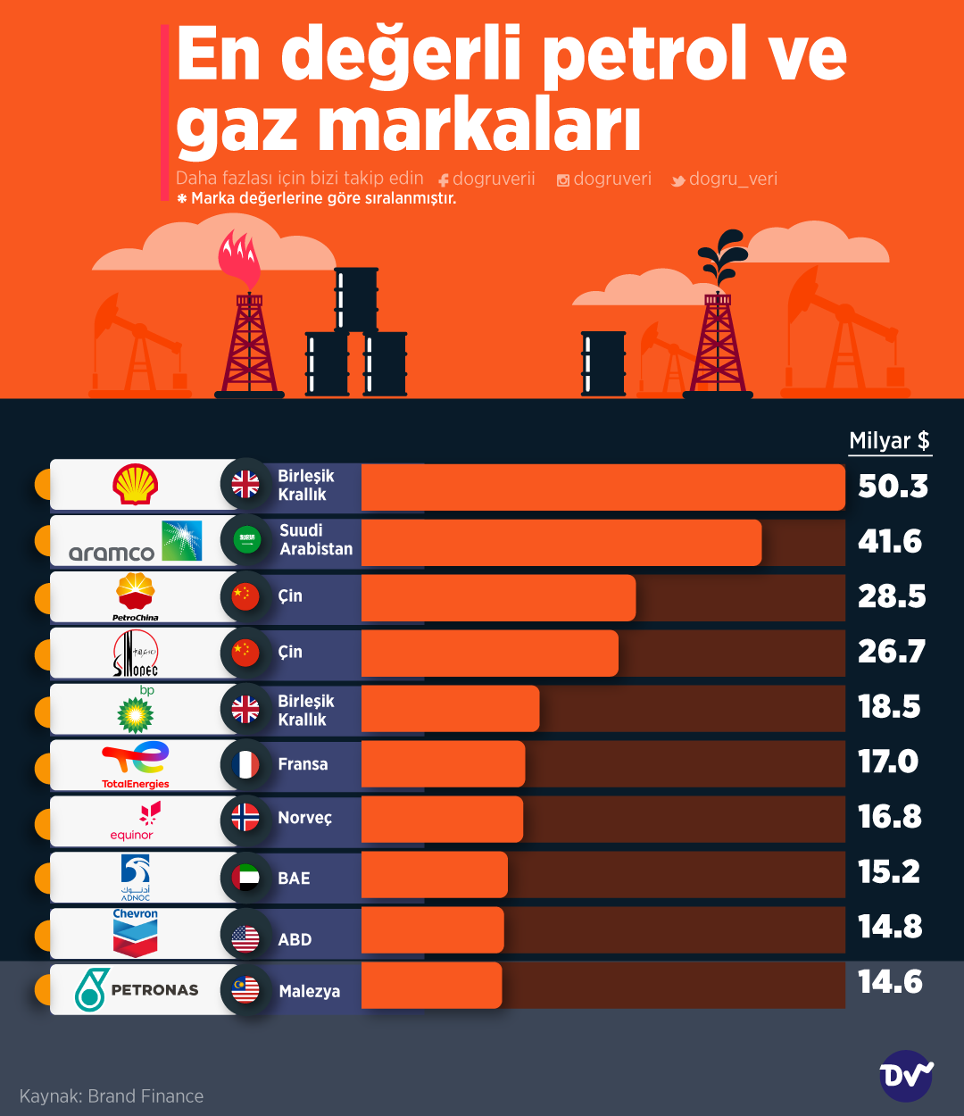 AnasayfaÜretim & TüketimEn değerli petrol ve gaz markalarıÜretim & TüketimEkonomi En değerli petrol ve gaz markaları Paylaş Brand Finance, dünyanın en değerli petrol ve gaz markalarını açıkladı. Listenin başında Birleşik Krallık markası Shell yer alıyor. Shell’in marka değeri yaklaşık 50 milyar dolar. 99 Paylaş