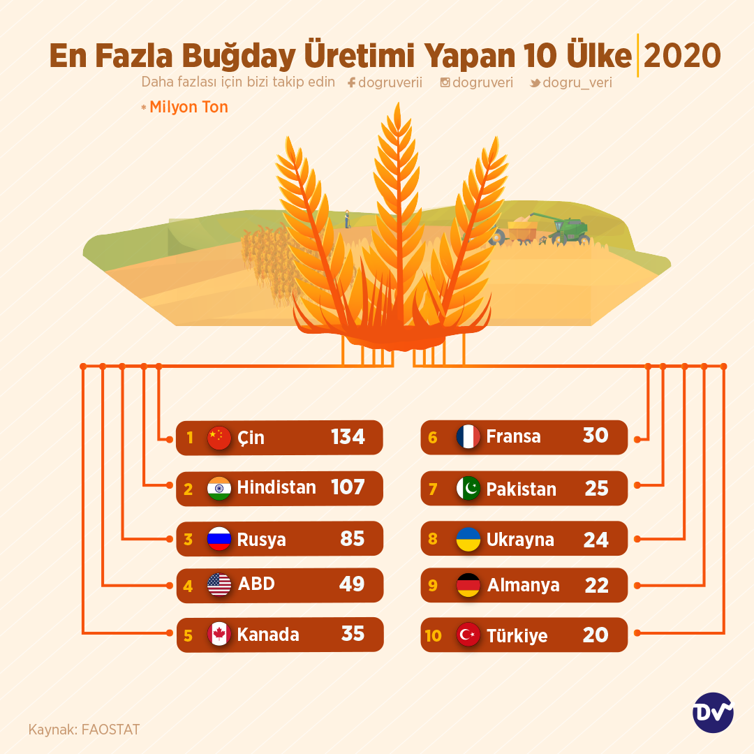 AnasayfaÜretim & TüketimEn fazla buğday üretimi yapan 10 ülkeÜretim & TüketimÇevreEkonomi En fazla buğday üretimi yapan 10 ülke Paylaş Buğday, yapısı bakımından gıdaların birçoğunda kullanılan önemli bir ulusal değer. Dünyadaki birçok gelişmekte olan ülkelerdeki buğday üretimini ve Türkiye’nin bu listedeki yerini gösteren bir istatistik derledik. 183 Paylaş