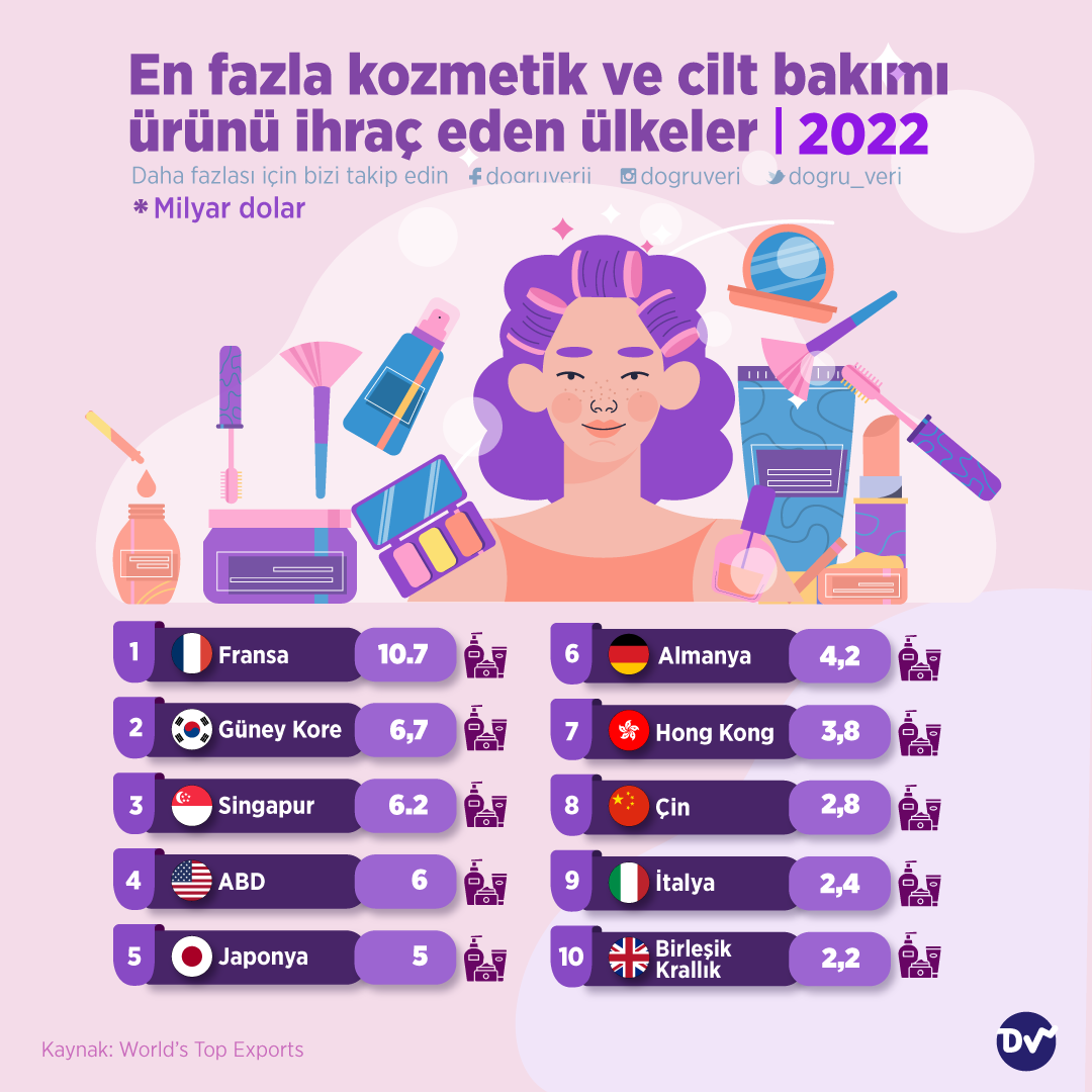 World’s Top Export’un verilerine göre kozmetik ve cilt bakımı ürünlerinin ihracatında ilk sırayı 10,7 milyar dolar ile Fransa alıyor. Onu, 6,7 milyar dolar ile Güney Kore ve 6,2 milyar dolar ile Singapur takip ediyor.