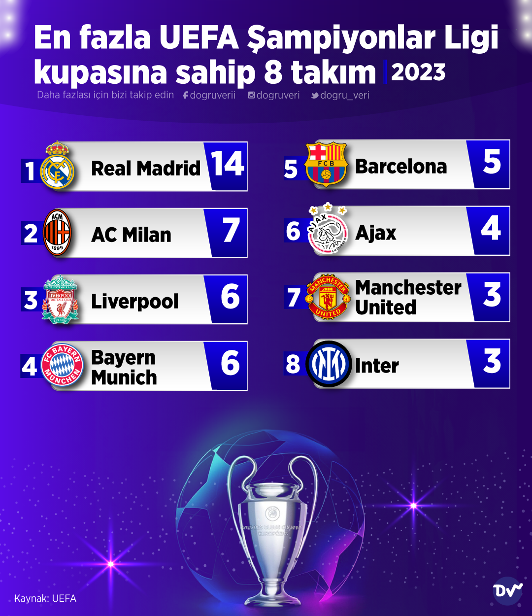 UEFA’nın yayımladığı verilere göre en fazla UEFA Şampiyonlar Ligi kupasına sahip takımların başında 14 kupa ile Real Madrid geliyor. İspanyol takımı 7 kupa ile İtalyan futbol kulübü AC Milan takip ediyor. Liverpool, Bayern Munich, Barcelona, Ajax, Manchester United ve Inter de en fazla UEFA kupasına sahip takımlar arasında yer alıyor.
