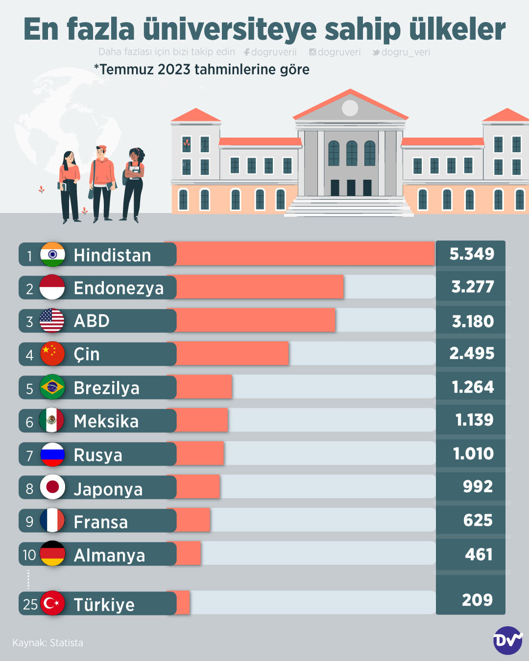 Statista’nın verdiği listeye göre en fazla üniversiteye sahip ülkeleri sıraladık. Temmuz 2023 tahminlerine göre oluşturulan listeye göre Hindistan, 5.349 üniversite ile ilk sırada yer alıyor. Endonezya ve ABD de Hindistan’ı takip ediyor. Türkiye, 209 üniversite ile 25. sırada.