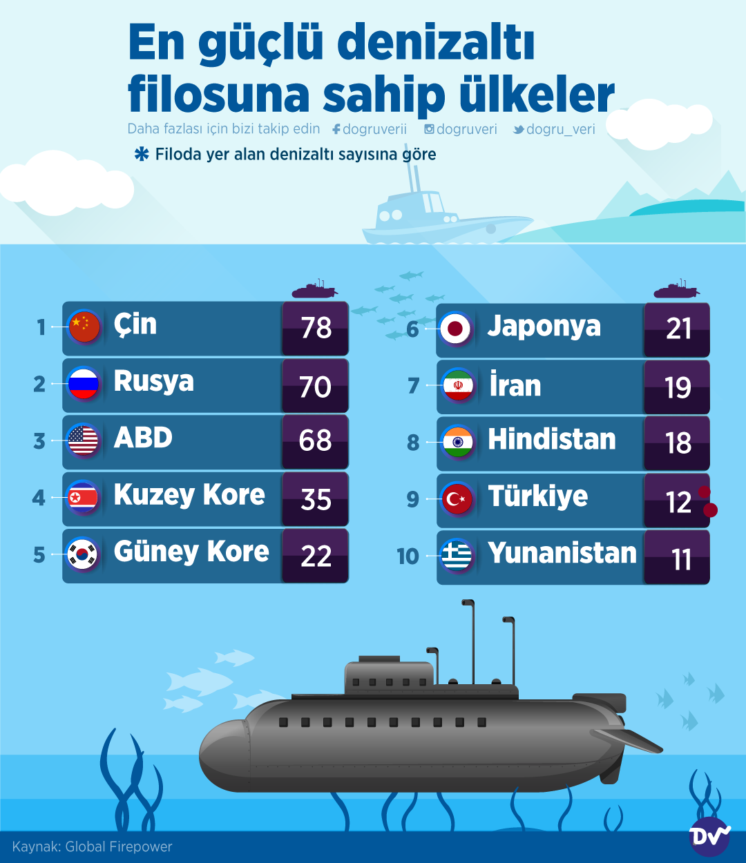 AnasayfaAskeriEn güçlü denizaltı filosuna sahip ülkelerAskeri En güçlü denizaltı filosuna sahip ülkeler Paylaş Global Firepower’dan aldığımız bilgiler doğrultusunda filosunda en fazla denizaltına sahip olan ülkeleri derledik. Buna göre Çin 78 denizaltıyla ilk sırada yer alırken onu, 70 denizaltıyla Rusya ve 68 denizaltıyla ABD takip ediyor. 822 Paylaş