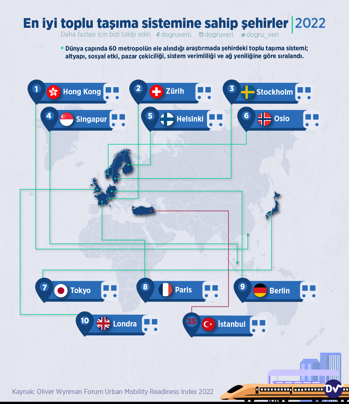 Altyapı, sosyal etki, pazar çekiciliği, sistem verimliliği ve ağ yeniliği kriterlerine göre en iyi toplu taşıma sistemine sahip 10 şehri derledik. Listenin başında Hong Kong yer alırken 2. sırada Zürih, 3. sırada Stockholm, 4. sırada Singapur ve 5. sırada ise Helsinki yer aldı.