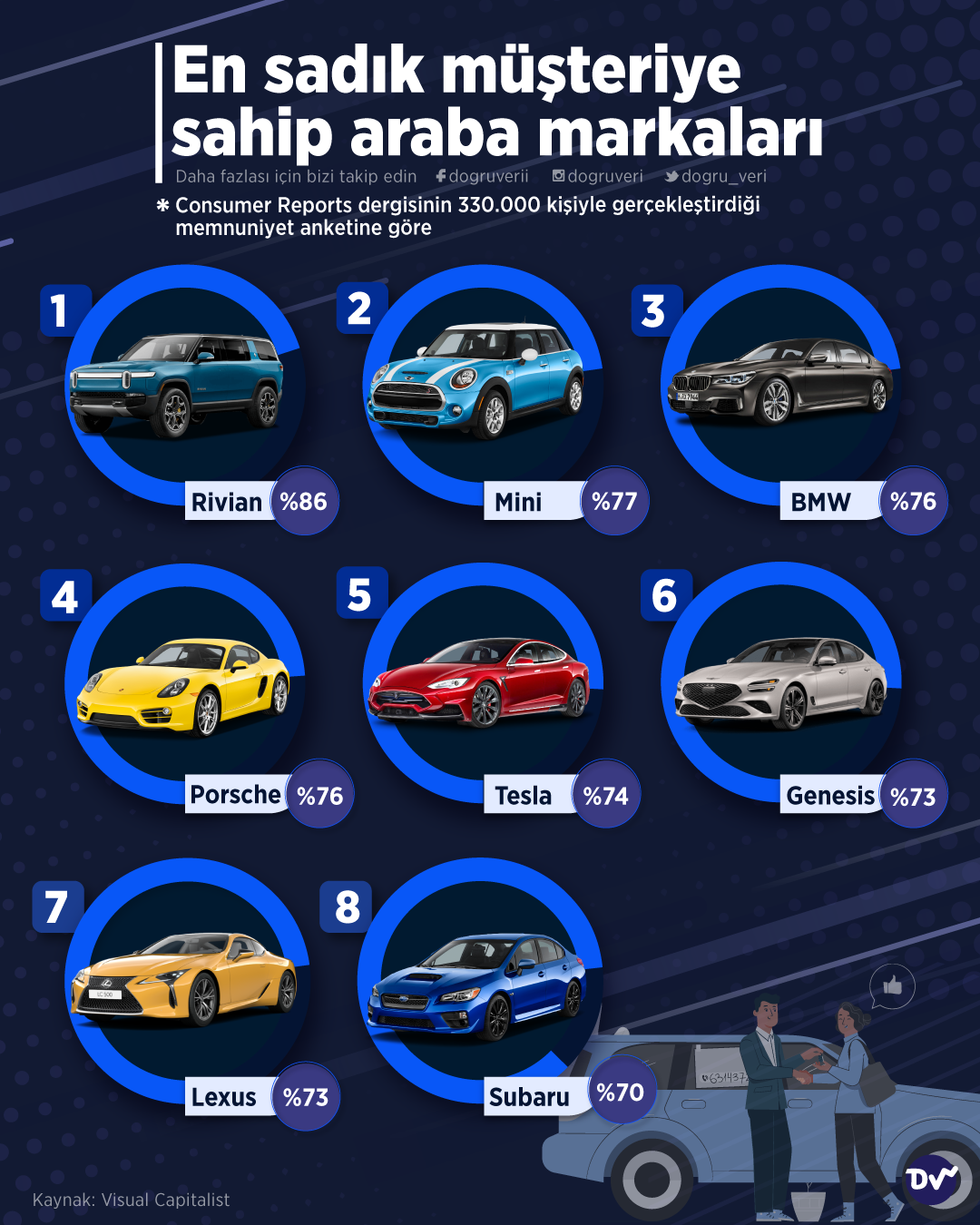AnasayfaÜretim & TüketimEn sadık müşteriye sahip araba markalarıÜretim & Tüketim En sadık müşteriye sahip araba markaları Paylaş Müşterilerinin en sadık olduğu araba markalarını derledik. Rivian, Mini ve BMW müşterilerinin en memnun olduğu markaların başında geliyor. 177 Paylaş