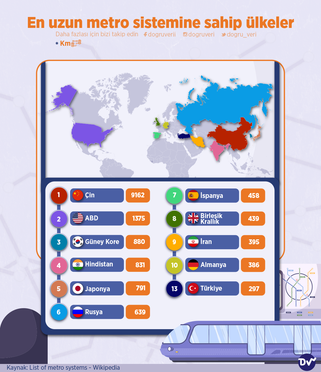 En uzun metro sistemine sahip ülkeleri derledik. Listenin başında 9.162 km metro sistemiyle Çin, 2. sırada 880 km metro sistemiyle Güney Kore ve 3. sırada 831 km metro sistemiyle Hindistan bulunurken Türkiye ise 297 km metro sistemiyle 13. sırada yer aldı.