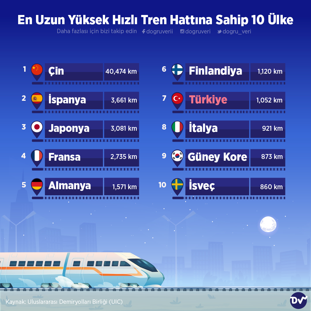 En uzun yüksek hızlı tren hattına sahip ülkelerin başında açık ara fark ile Çin geliyor. Çin’deki yüksek hızlı tren hattının uzunluğu 40 bin 474 kilometre. Ona en yakın olan ülke, 3 bin 661 bin km ile İspanya. Türkiye ise bin 52 km ile 7. sırada.