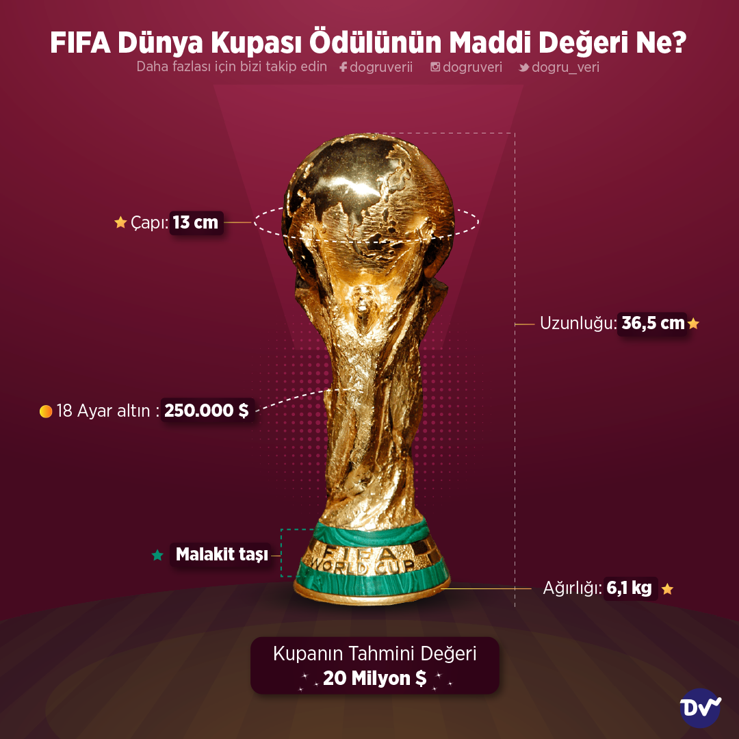 Her dört yılda bir gerçekleştirilen FIFA Dünya Kupası, dünyanın hemen her ülkesinden futbolsever tarafından ilgiyle takip edilen en prestijli turnuvalardan birisi. Peki bu turnuvanın galibine takdim edilen Dünya Kupası ödülünün fiziksel ölçüleri ve maddi değeri ne? Bunu araştırıp sizlere sunduk.