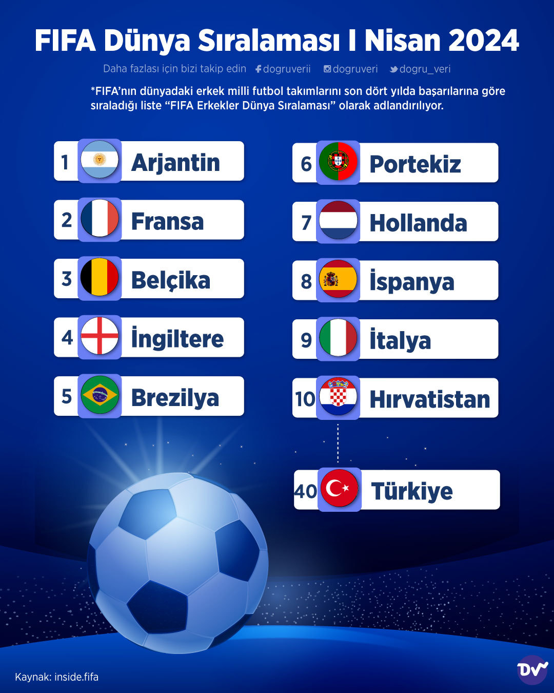 AnasayfaDiğerFIFA Dünya Sıralaması I Nisan 2024Diğer FIFA Dünya Sıralaması I Nisan 2024 Paylaş FIFA’da oynayan ülkeleri başarılarına göre sıraladık. Bünyesinde pek çok başarılı futbolcu bulunduran Arjantin ilk sırada yer alıyor. Türkiye ise FIFA’nın son dört yılda başarı oranlarına göre hazırladığı listeye göre 40. sırada bulunuyor. 256 Paylaş