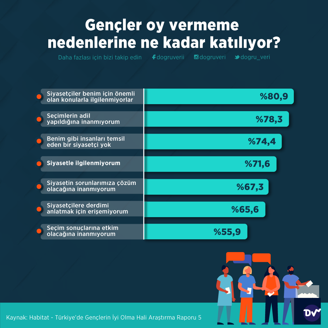 Habitat’ın raporuna göre gençlerin oy vermeme nedenlerine katılım oranlarını derledik. Buna göre araştırmaya katılan gençlerin yüzde 80,9’u siyasetçilerin onlar için önemli olan konularla ilgilenmediğini düşünüyorlar.