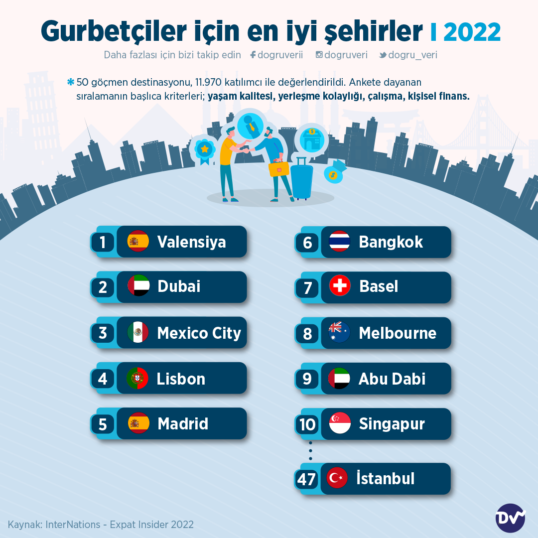 Gurbetçiler için en iyi şehirleri yaşam kalitesi, yerleşme kolaylığı, çalışma ve kişisel finans gibi kriterlerin baz alındığı ankete göre derledik. Sıralama şu şekilde: Valensiya, Dubai, Mexico City, Lisbon, Madrid, Bangkok, Basel, Melbourne, Abu Dabi ve Singapur.