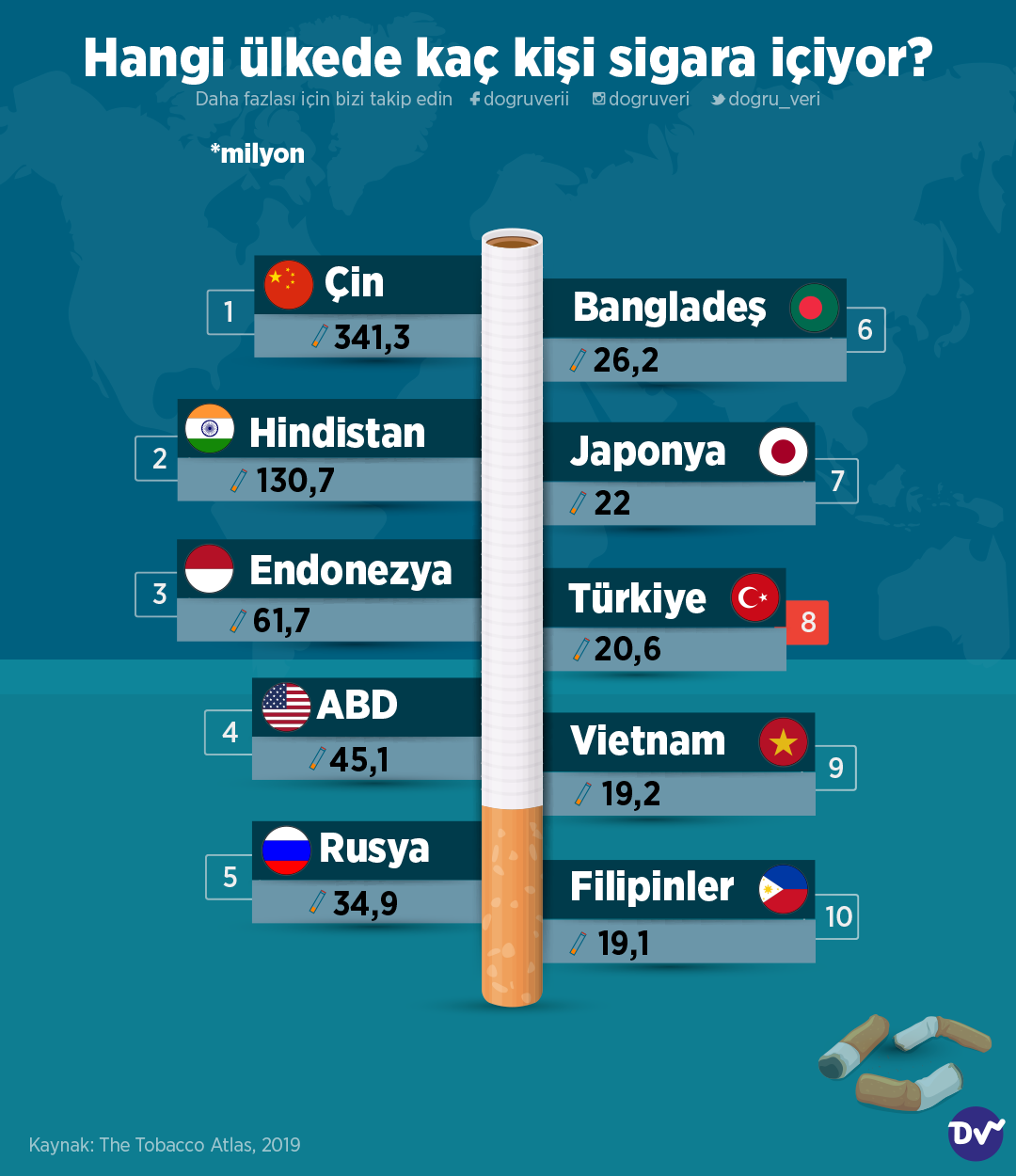AnasayfaDiğerHangi ülkede kaç kişi sigara içiyor?DiğerÜretim & Tüketim Hangi ülkede kaç kişi sigara içiyor? Paylaş En çok sigara içilen ülkeleri sizin için derledik. En çok sigara içilen ülke 341,3 milyon kullanıcı sayısıyla Çin olurken Hindistan 130,7 milyonla 2. sırada ve Endenozya ise 61,7 milyonla 3. sırada yer aldı. 357 Paylaş