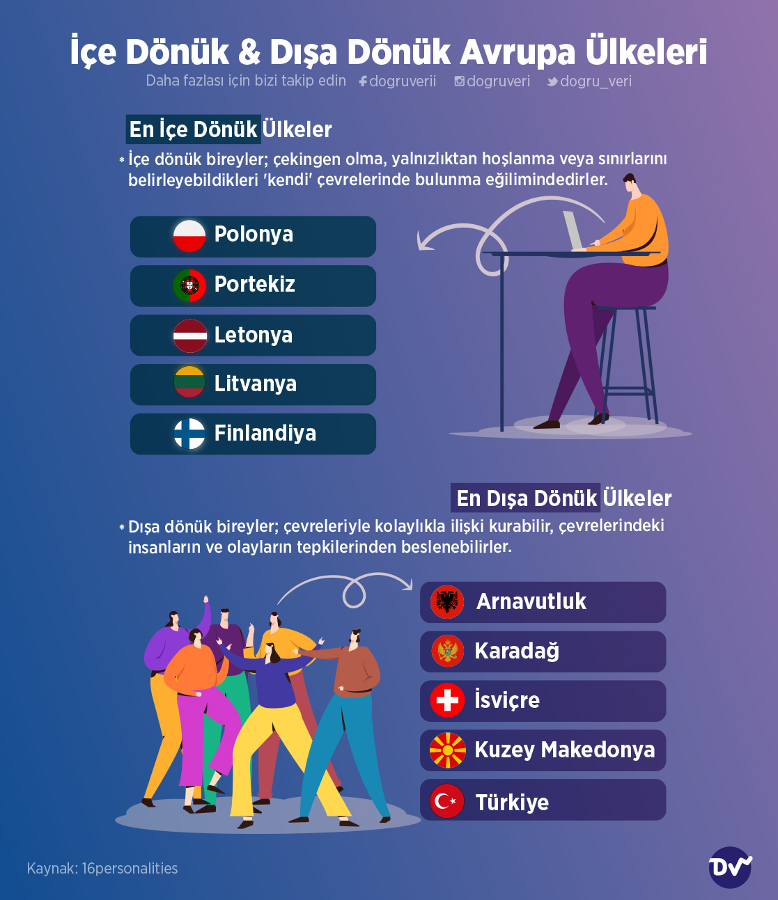 16personalities, çeşitli kişilik özelliklerine göre dünya haritası üzerinde ülkelerde baskın olan ilgili kişilik özelliğini verdiği bir harita yayınlıyor. Bu haritaya göre Avrupa ülkeleri arasından en içe dönük olan Polonya olurken en dışa dönük olan ise Arnavutluk oluyor. Türkiye ise en dışa dönük ülkeler arasında 5. sırada yer alıyor.