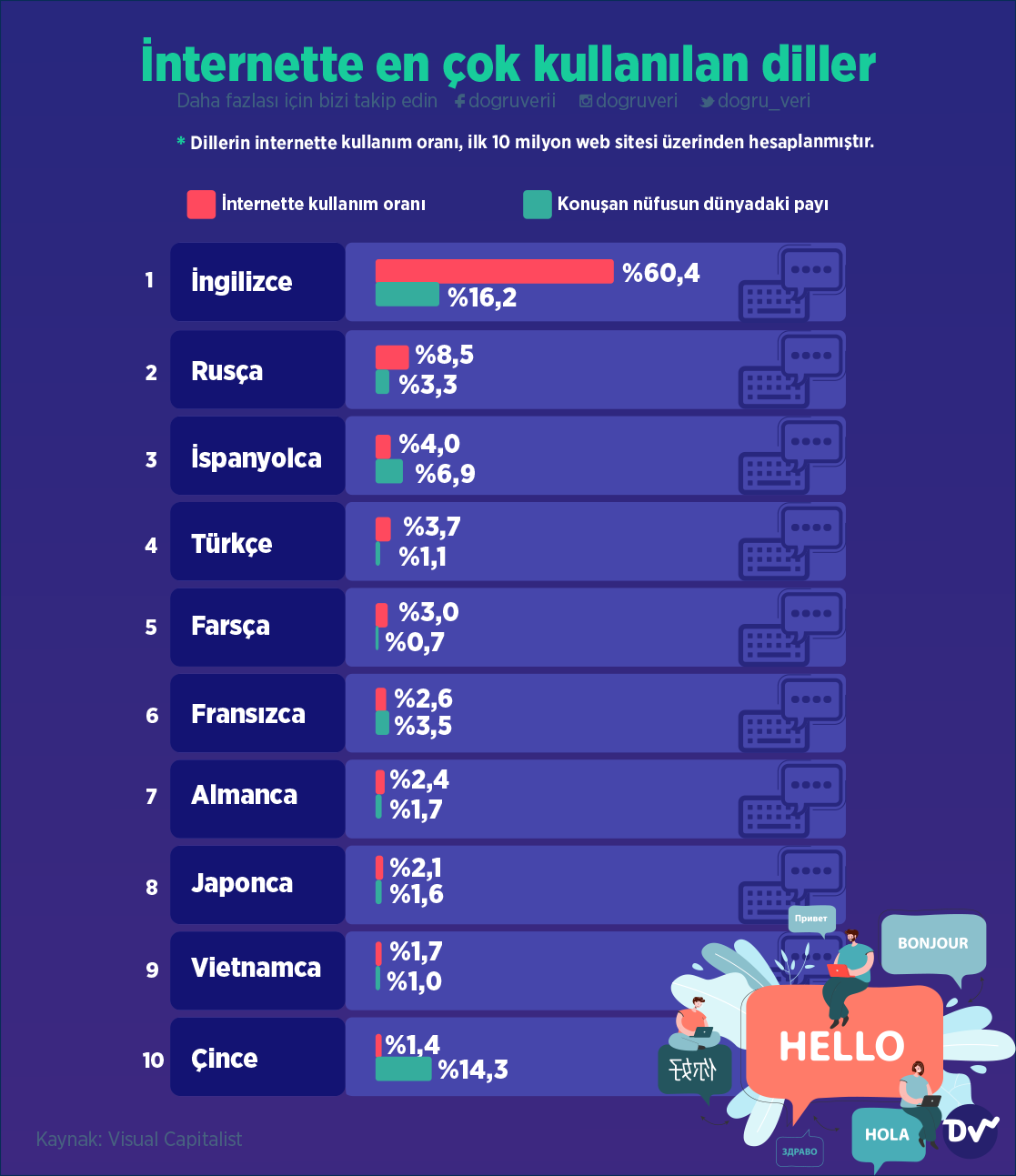 İlk 10 milyon web sitesini baz alarak internette en çok kullanılan dilleri derledik. Derleme yapılırken dillerin internette kullanım oranı ve konuşan nüfusun dünyadaki payı da verilmiştir. Listeye göre İngilizce 1. sırada, Rusça 2. sırada, ve İspanyolca 3. sırada yer alırken Türkçe 4. sırada yer aldı. Dünyada en çok konuşulan 2. dil olan Çince ise listede 10. sırada yer aldı.