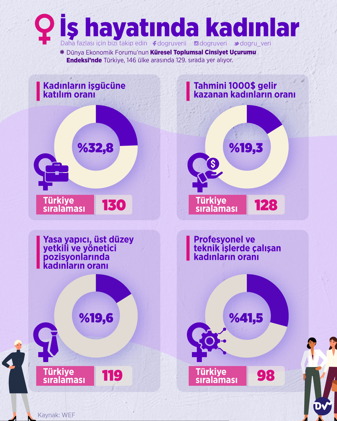 AnasayfaEkonomiİş hayatında kadınlarEkonomi İş hayatında kadınlar Paylaş İş hayatında yer alan kadınlara dair bazı istatistikleri derledik. 140 ülkenin bulunduğu Küresel Toplumsal Cinsiyet Uçurumu Endeksi’ne göre kadınların işgücüne katılım oranı sıralamasında Türkiye 130. sırada bulunuyor. 39 Paylaş