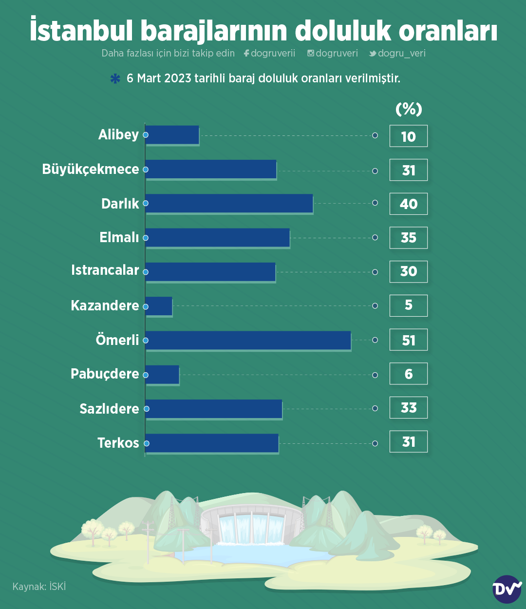 İSKİ’nin bugün itibarıyla paylaştığı bilgileri baz alarak baraj doluluk oranlarını derledik. Buna göre, İstanbul’un su ihtiyacını karşılayan 10 barajda kuraklığa bağlı düşüş yaşanıyor. 10 baraj arasından yalnızca Ömerli barajının doluluk oranı yüzde 50’nin üstünde.
