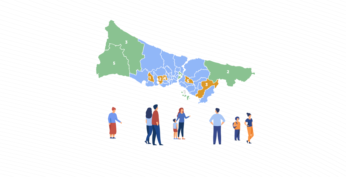 Türkiye İstatistik Kurumu’nun (TÜİK) Adrese Dayalı Nüfus Kayıt Sistemi verilerine göre İstanbul’da en fazla nüfusa sahip ilçeler Esenyurt, Küçükçekmece, Pendik, Bağcılar ve Ümraniye iken en az nüfusa sahip ilçeler ise Adalar, Şile, Çatalca, Beşiktaş ve Silivri şeklinde sıralanıyor.