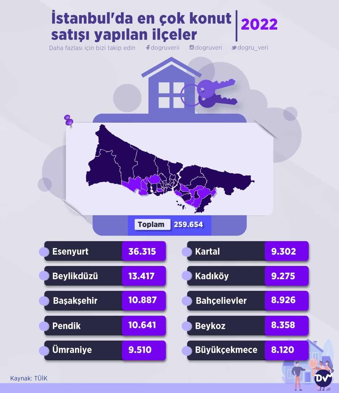 TÜİK’in Haziran ayı Konut Satış İstatistikleri’ne göre İstanbul’da en çok konut satışı yapılan ilçeleri derledik. Buna göre, ilk sırada 36.315 konut satışıyla Esenyurt yer alırken onu, 13.417 satışla Beylikdüzü ve 10.887 satışla Başakşehir takip ediyor.