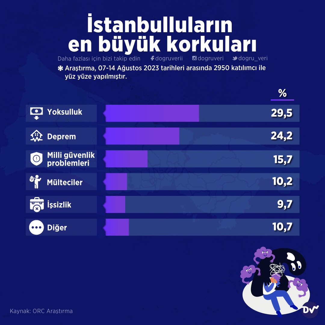 İstanbulluların en büyük korkularının değerlendirildiği araştırma sonuçları açıklandı. Yüz yüze katılımcılarla gerçekleştirilen anket sonuçlarına göre İstanbulluların en büyük korkusu %29,5 ile yoksulluk, %24,2 ile deprem, %15,7 ile milli güvenlik problemleri oldu.