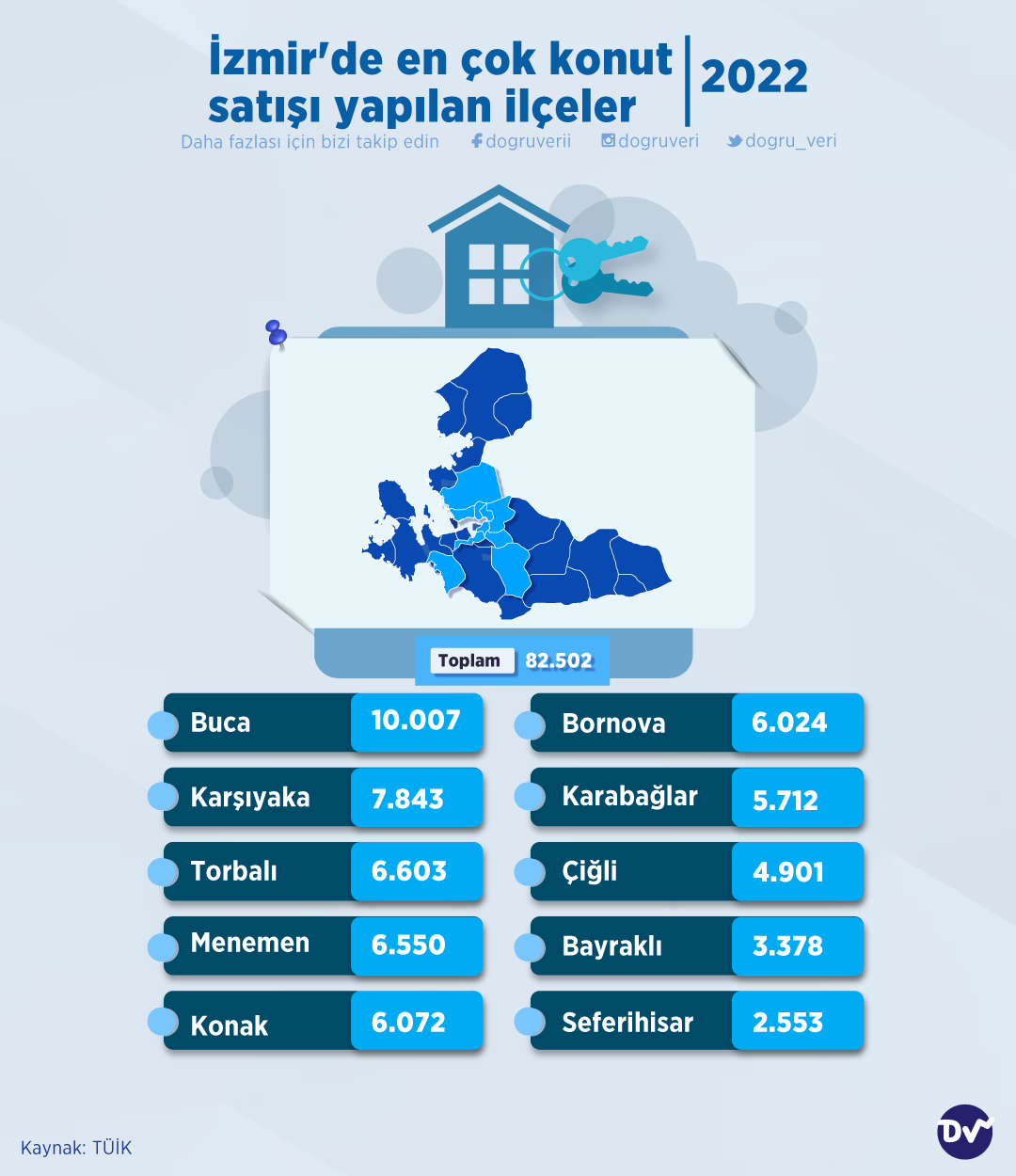TÜİK’in Haziran ayı Konut Satış İstatistikleri’ne göre İzmir’de en çok konut satışı yapılan ilçeleri derledik. Buna göre, ilk sırada 10.007 konut satışıyla Buca yer alırken onu, 7.843 satışla Karşıyaka ve 6.603 satışla Torbalı takip ediyor.