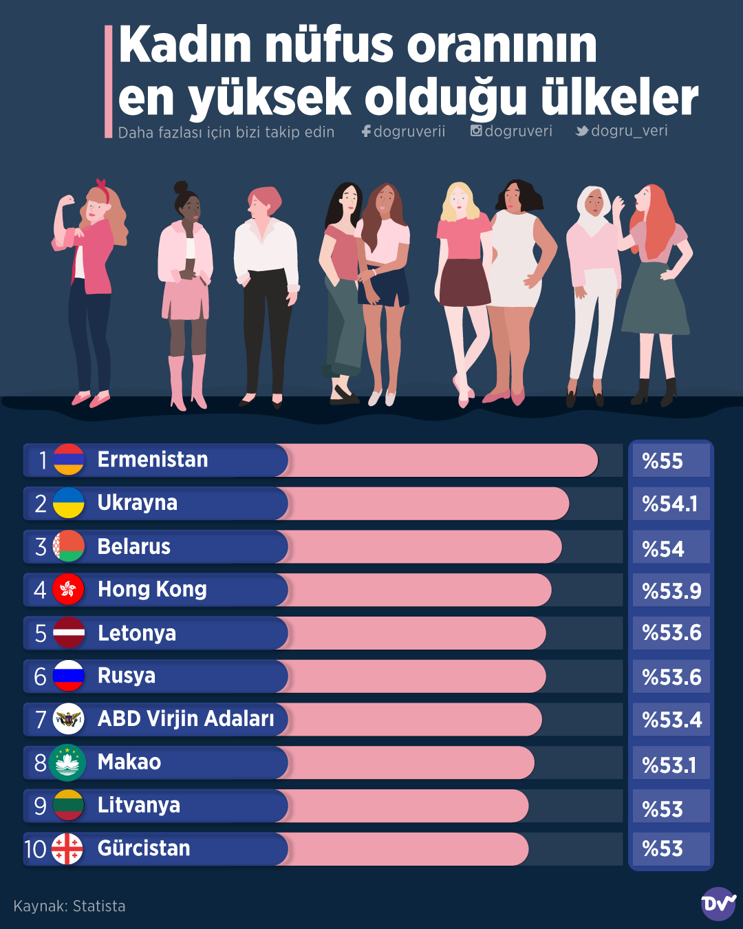 AnasayfaNüfusKadın nüfusunun en yüksek olduğu ülkelerNüfus Kadın nüfusunun en yüksek olduğu ülkeler Paylaş Statista’nın verilerine göre kadın nüfusunun en yüksek olduğu ülkeleri derledik. Veriye göre ilk sırada %55’lik kadın oranıyla Ermenistan yer alıyor. Onun arkasından Ukrayna ve Belarus geliyor. 5.275 Paylaş