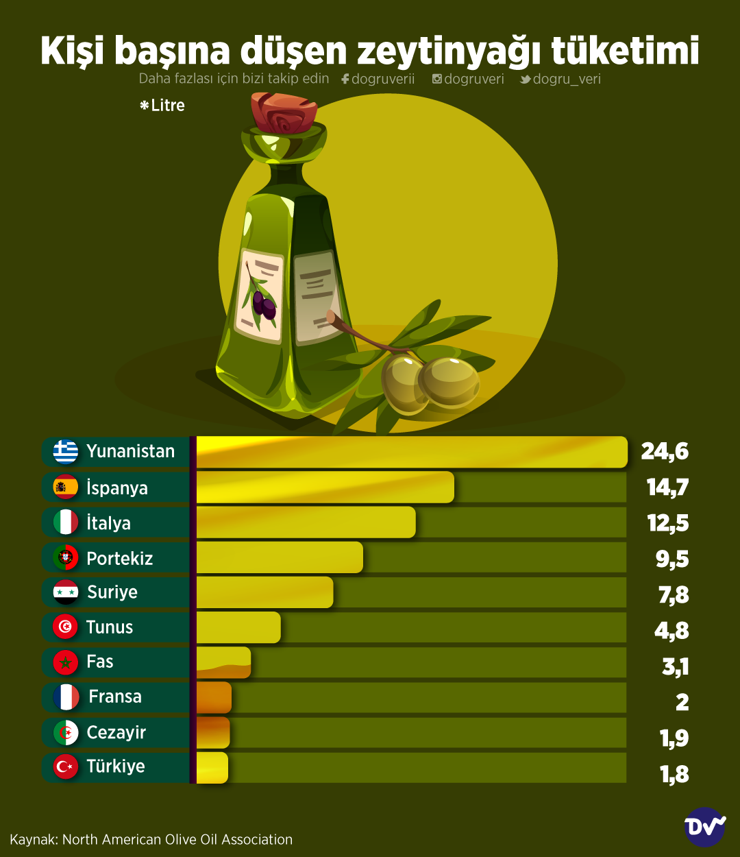 North American Olive Oil Association’dan aldığımız verilere göre, ülkelerde kişi başına düşen zeytinyağı tüketimi miktarını litre cinsinden derledik. Buna göre ilk sırada 24,6 litre ile Yunanistan yer alırken Türkiye 1,8 litre ile onuncu sırada bulunuyor.