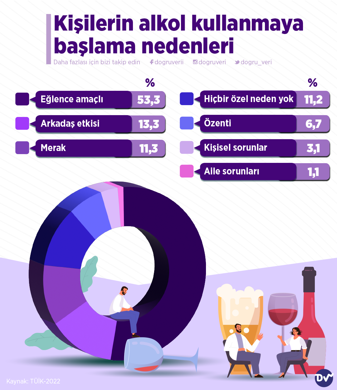AnasayfaÜretim & TüketimKişilerin alkol kullanmaya başlama nedenleriÜretim & Tüketim Kişilerin alkol kullanmaya başlama nedenleri Paylaş Kişilerin alkol kullanmaya başlama nedenlerini derledik. Birinci sırada %53,3 ile eğlence amaçlı başlandığı yer alırken ikinci sırada ise %13,3 ile arkadaş etkisi yer alıyor. 113 Paylaş