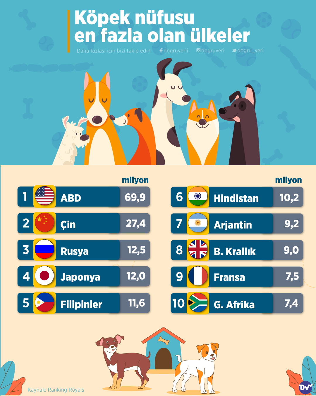 AnasayfaNüfusKöpek nüfusu en fazla olan ülkelerNüfus Köpek nüfusu en fazla olan ülkeler Paylaş Köpek nüfusunun fazla olduğu ülkeleri araştırdık. ABD, 69,9 milyonluk köpek nüfusuyla listenin başında yer alıyor. ABD’yi Çin, Rusya ve Japonya takip ediyor. 98 Paylaş