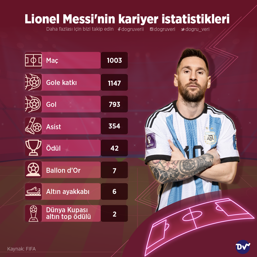 Lionel Messi’nin 2003’ten bugüne kadar ki kariyer istatistiklerini derledik. Buna göre Messi kariyeri boyunca çıktığı 1003 maçta 793 gole ve 354 asiste sahip. Bunun dışında derlemeye göre Messi bugüne kadar, 42 Ödül, 7 Ballon d’Or, 6 Altın ayakkabı ve 2 Dünya Kupası altın top ödülü kazandı.