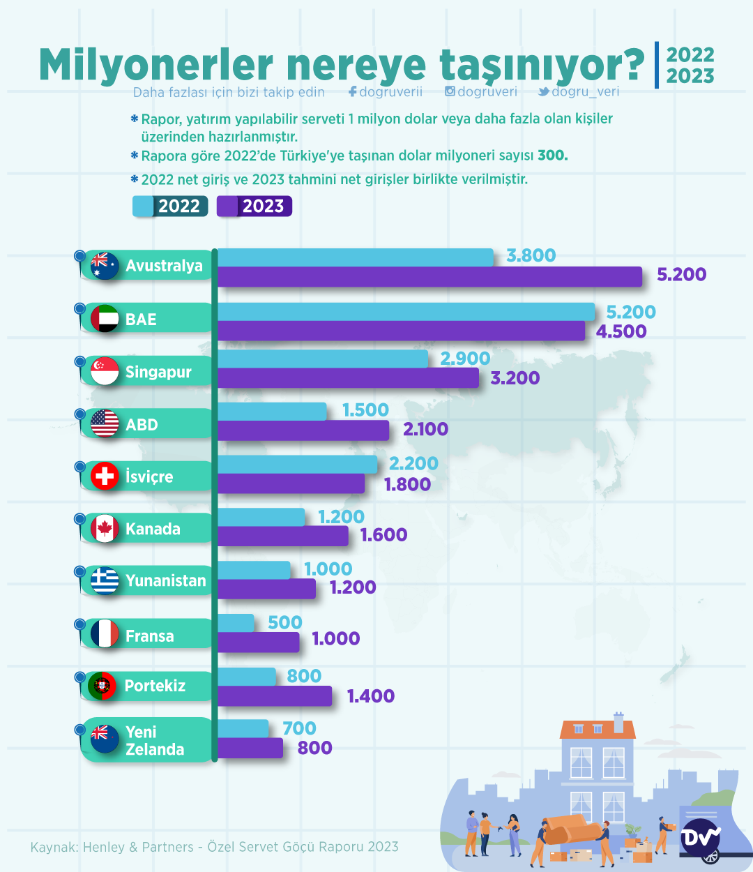 Londra merkezli danışmanlık şirketi Henley & Partners ‘ın hazırladığı Özel Servet Göçü Raporuna göre yatırım yapılabilir serveti 1 milyon dolar ve üzeri olan kişilerin 2022 ve 2023 yıllarında en çok taşındıkları ülkeleri derledik. Avustralya’ya 2022’de 3.800 milyonerin göç etmiş. Bu yılki hareketin 5.200 olacağı tahmin ediliyor. Türkiye’ye 2022 yılında taşınan milyoner sayısı ise 300.
