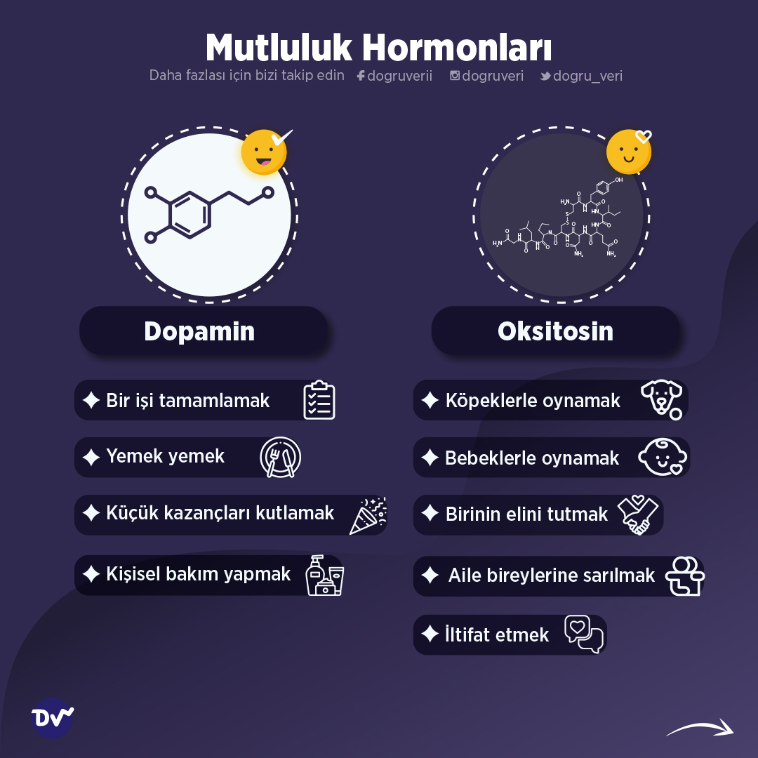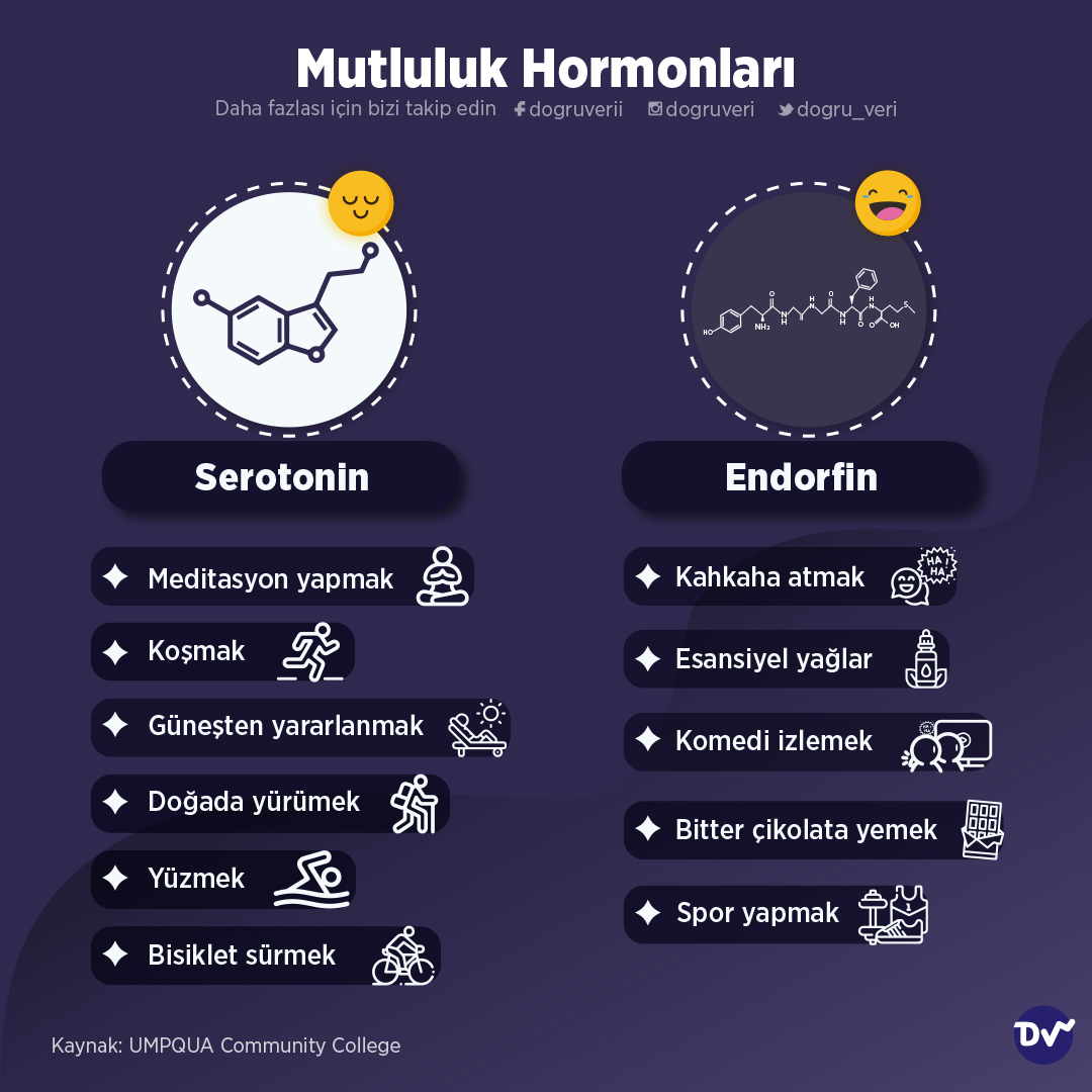 UMPQUA Community College’in derlediği içerikten aldığımız yardımla mutluluk veren, kişilerin kendilerini iyi hissetmelerini sağlayan kimyasalları listeledik. Her bir hormon farklı aktiviteler sayesinde artabiliyor. Örneğin meditasyon yaparak serotonin, bitter çikolata yiyerek endorfin, kişisel bakım yaparak dopamin ve köpeklerle oynayarak oksitosin salgılanmasına yardımcı olmak; dolayısıyla daha iyi hissetmek mümkün olabiliyor.