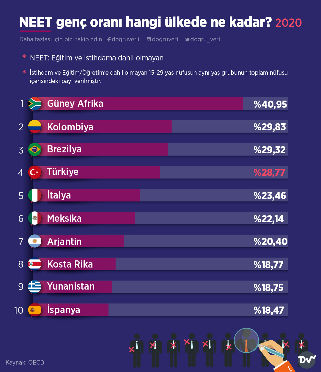 OECD; istihdam ve eğitim-öğretime dahil olmayan 15-29 yaş nüfusun aynı yaş grubunun toplam nüfusu içerisindeki payını hesaplayarak ülkelerdeki NEET oranına ulaşmış. Bu istatistiğe göre NEET sayısı en fazla olan ülkeler Güney Afrika, Kolombiya, Brezilya, Türkiye ve İtalya.