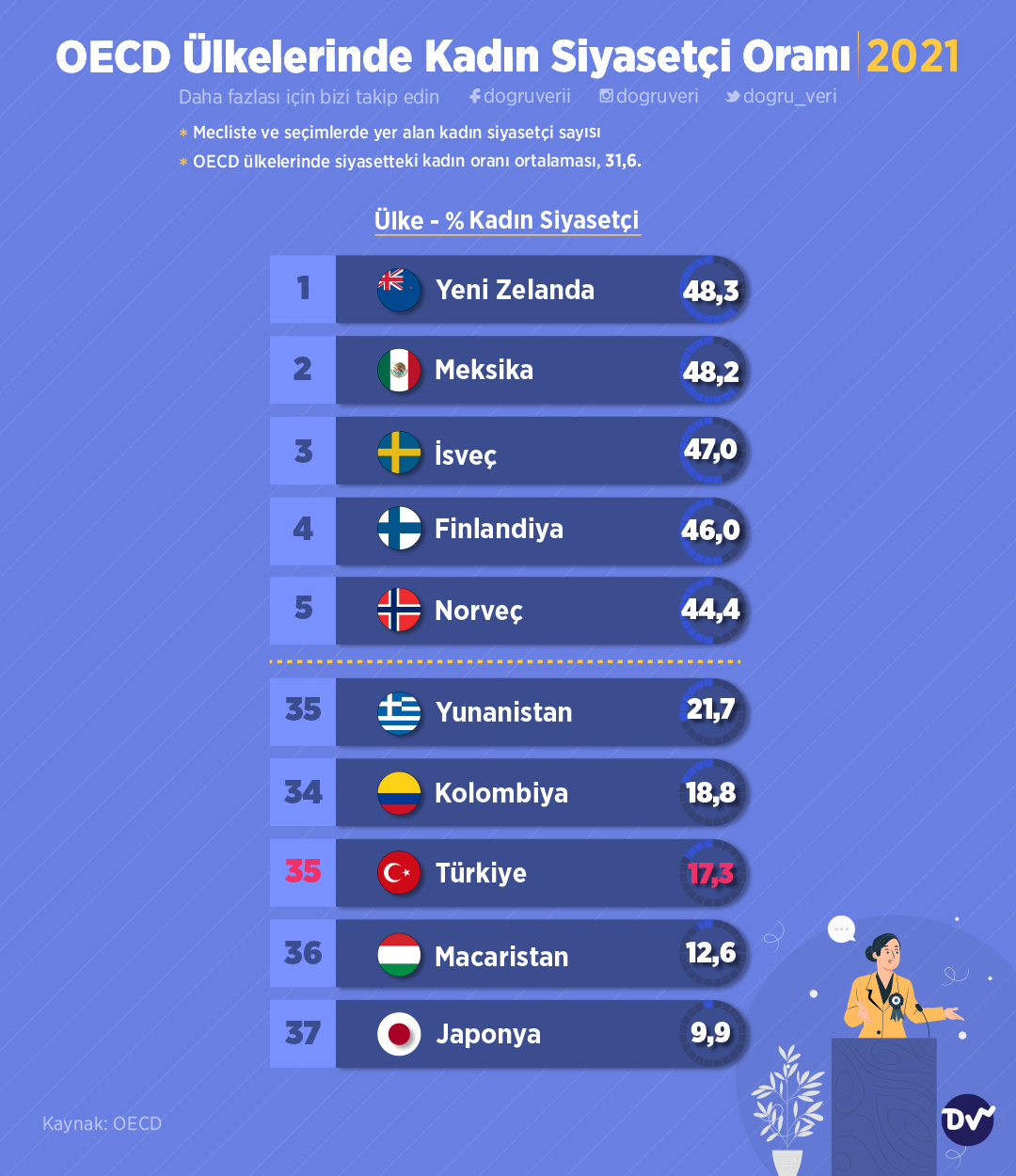 OECD’nin kadın siyasetçilerin oranına yoğunlaştığı araştırmasına göre mecliste ve seçimlerde en çok kadın siyasetçinin rol aldığı ülke %48,3’lük oranla Yeni Zelanda. Onu %48,2 ile Meksika, %47 ile İsveç takip ediyor.