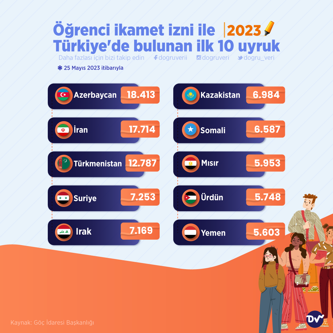 AnasayfaNüfusÖğrenci ikamet izni ile Türkiye’de bulunan ilk 10 uyruk I 2023Nüfus Öğrenci ikamet izni ile Türkiye’de bulunan ilk 10 uyruk I 2023 Paylaş Göç İdaresi Başkanlığı’nın verilerine göre Öğrenci ikamet izni ile Türkiye’de bulunan 10 uyruğu listeledik. Listenin başında Azerbaycan, İran ve Türkmenistan geliyor. 217 Paylaş