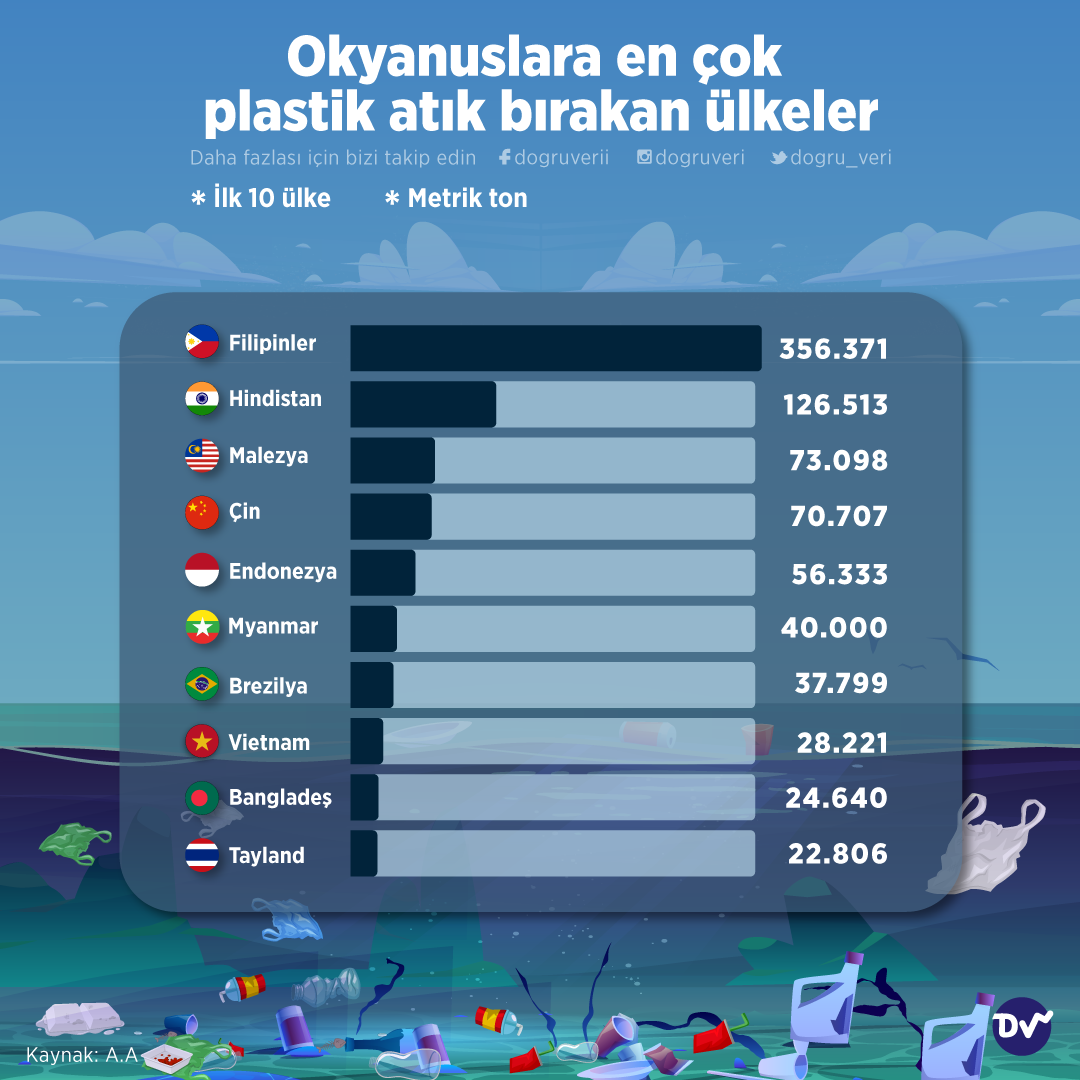 Okyanuslara en çok plastik atık bırakan ülkeleri listeledik. Yapılan araştırmalar her geçen gün plastiklerle kirlenen okyanusların büyük bir tehditle karşı karşıya olduğunu gözler önüne serdi. Buna göre listenin başında 356.371 metrik tonla Filipinler 1. sırada, 126.513 Hindistan metrik tonla 2. sırada, 73.098 metrik tonla Malezya 3. sırada yer alıyor.
