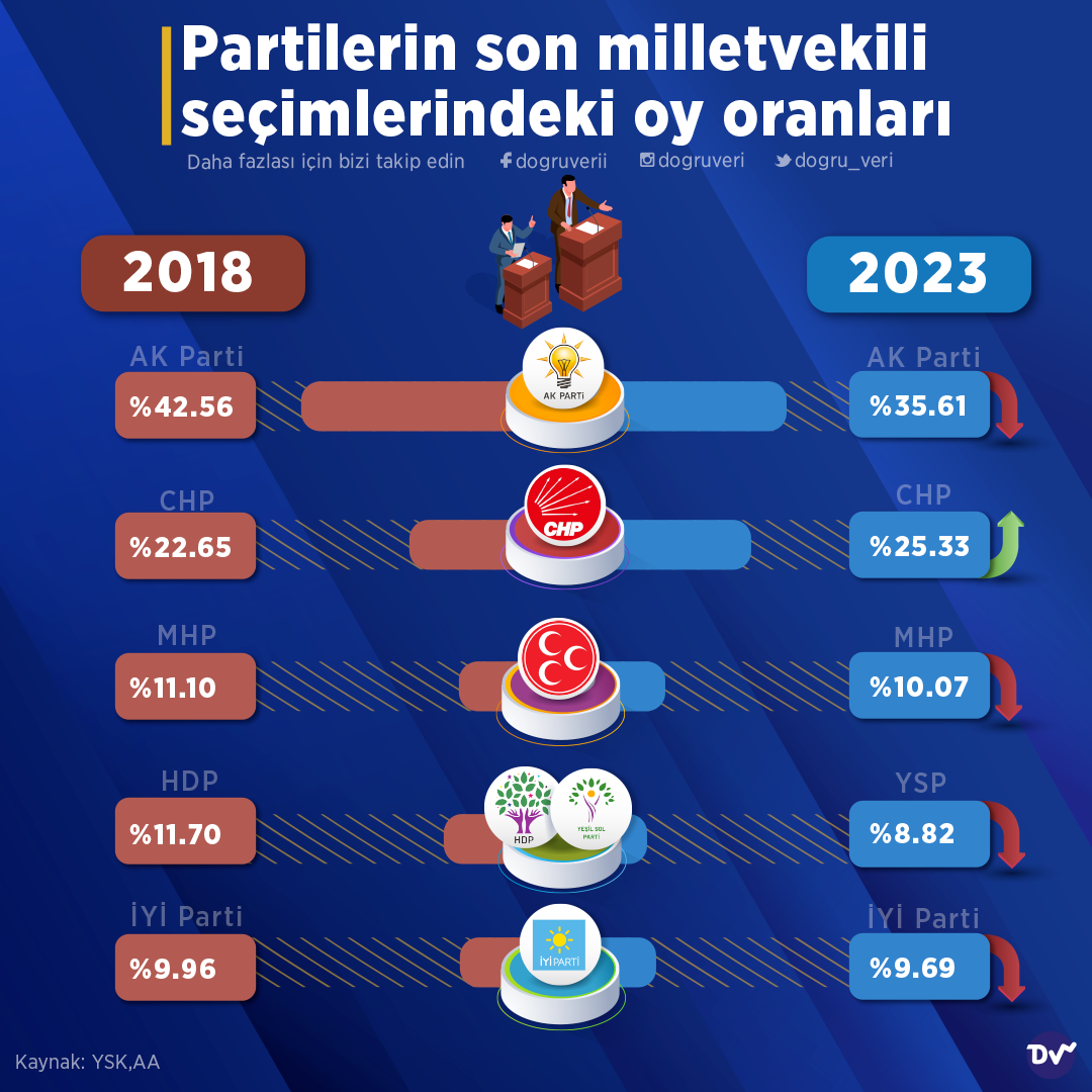 YSK ve AA verilerine göre, Partilerin son 2 milletvekili seçimlerindeki oy oranlarını derledik. Buna göre, AK Parti, MHP, YSP (HDP) ve İYİ Parti’nin oylarının düştüğü görülürken CHP’nin oylarının ise yükseldiği görülüyor.