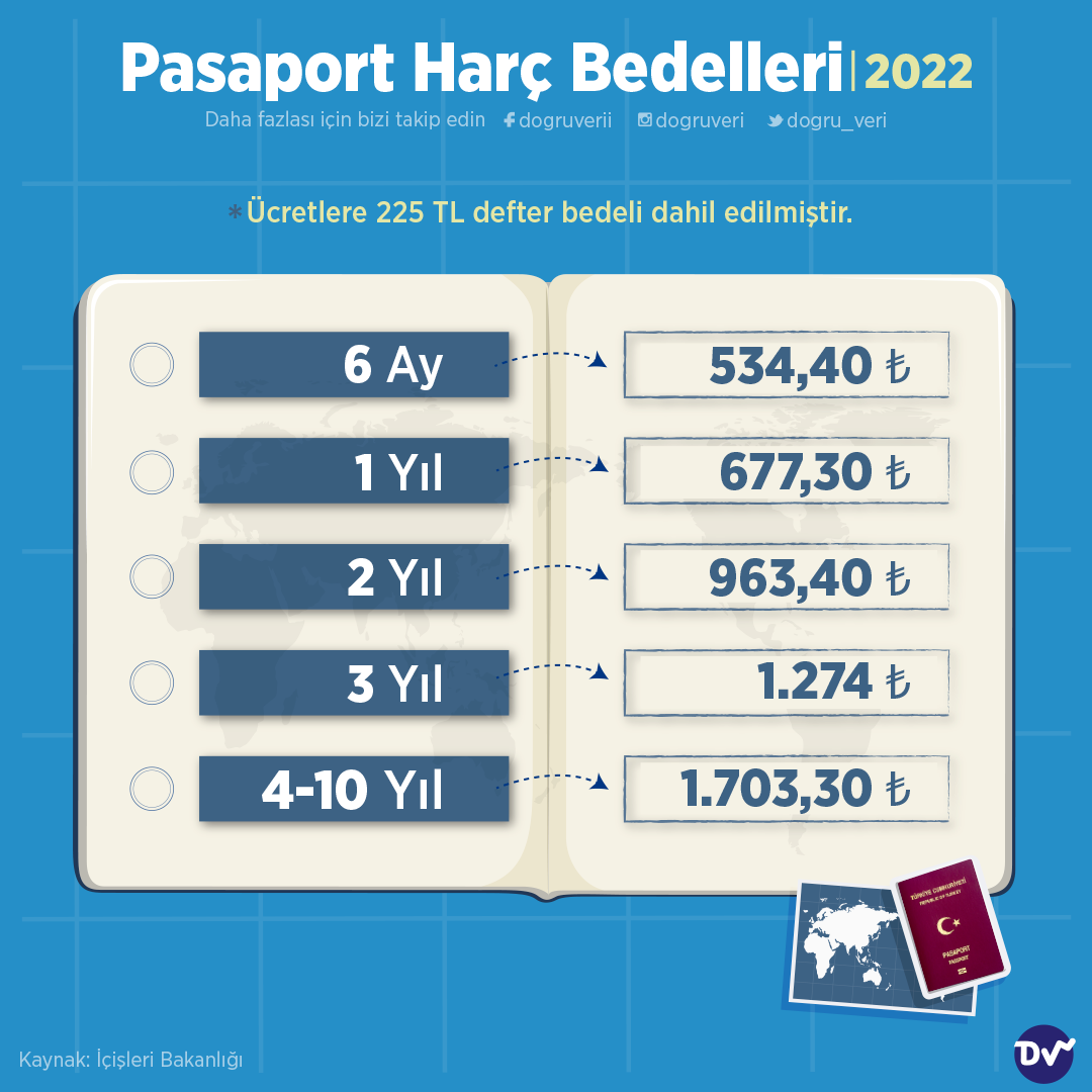 AnasayfaEkonomiPasaport harç bedelleriEkonomiSiyaset & Politika Pasaport harç bedelleri Paylaş 2022 yılı pasaport harç bedelleri şu şekilde: 6 ay: 534,40 TL 1 yıl: 677,30 TL 2 yıl: 963,40 TL 3 yıl: 1274 TL 4-10 yıl: 1703,30 TL 44 Paylaş