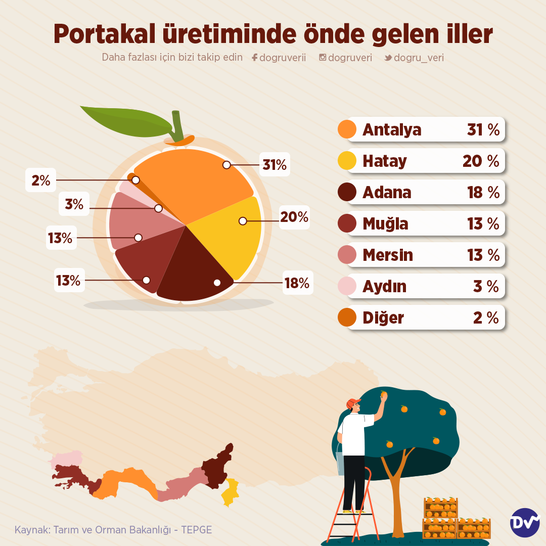 AnasayfaÜretim & TüketimPortakal üretiminde önde gelen illerÜretim & Tüketim Portakal üretiminde önde gelen iller Paylaş Türkiye’de Portakal üretiminde önde gelen illeri derledik. Buna göre üretimin yüzde 31’i Antalya’da gerçekleşirken Hatay’da yüzde 20’si, Adana’da yüzde 18’i, Muğla’da yüzde 13’ü, Mersin’de yüzde 13’ü ve Aydın’da yüzde 3’ü gerçekleşiyor. 64 Paylaş