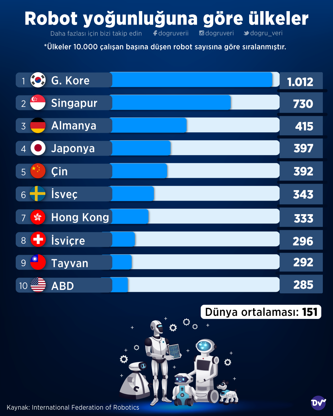 AnasayfaBilim & TeknolojiRobot yoğunluğuna göre ülkelerBilim & Teknoloji Robot yoğunluğuna göre ülkeler Paylaş Uluslararası Robotik Federasyonu’ndan aldığımız bilgilere göre ülkelerin robot yoğunluğunu sıraladık. 10.000 çalışan başına düşen robot sayısına göre sıralanan ülkelerin başında 1012 robotlar Güney Kore geliyor. 132 Paylaş